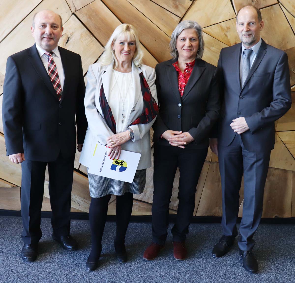 Personalrat Joachim Geiss (l.) und Landrat-Stellvertreter Joachim Bauer (r.) verabschiedeten Renate Moderer (wohnhaft in Angelbachtal, zuletzt beim Amt für Landwirtschaft und Naturschutz beschäftigt) sowie Marinela Indus (Mannheim/Amt für Gewerbeaufsicht und Umweltschutz) in den verdienten Ruhestand.