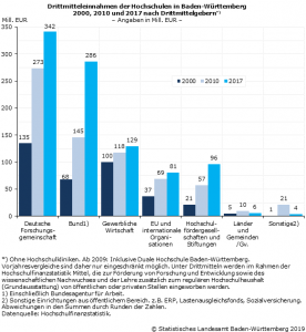Wie das Statistische Landesamt im Rahmen der Hochschulfinanzstatistik mitteilt, beliefen sich die Drittmitteleinnahmen der Hochschulen in Baden-Württemberg im Jahr 2017 auf insgesamt rund 943 Millionen (Mill.) Euro. Dies entspricht einer Steigerung von knapp 47 Mill. Euro bzw. 5,2 % im Vergleich zum Vorjahr.