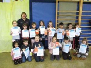Dann begann der erste Hilfe Kurs. Frau Schütz erklärte den Kindern wozu man Pflaster ,Kühlakku, Wundauflagen und Verbandspäckchen braucht und wie man damit umgeht. Dann wurde es Ernst : Jedes unserer Kinder musste einem anderen Kind einen Verband anlegen. Um dies realistisch zu gestalten schminkte Frau Schütz jedem Kind , das wollte, eine Schürfwunde – natürlich mit roter Schminke und Theaterblut. Diese nicht leichte Aufgabe lösten unsere wilden Einhörner mit Bravur. – und weil alle alles so gut gemacht haben ,bekam jeder zur Belohnung eine Urkunde für den ersten bestandenen Erste Hilfe Kurs.