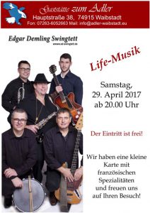 Das Edgar Demling Swingtett spielt mal wieder. Ihr könnt uns am 29.04.2017 ab 20.00 Uhr in Waibstadt im ADLER hören. Die näheren Infos könnt ihr dem Plakat im Anhang entnehmen.