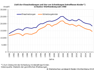Im vergangenen Jahr wurden in Baden-Württemberg 18 356 Ehen geschieden. Damit ist die Zahl der Ehescheidungen nach Angaben des Statistischen Landesamtes zum 6. Mal in Folge gegenüber dem Vorjahr zurückgegangen. Gegenüber 2004, als mit 25 129 Scheidungen der bisherige Höchststand seit Bestehen des Landes Baden-Württemberg registriert wurde, sind die Scheidungszahlen sogar um ein Viertel gesunken. Im Vergleich zu 1990 lag die Zahl der Ehescheidungen im vergangenen Jahr allerdings um ein Zehntel höher, seit 1980 hat sie sich sogar um rund 40 % erhöht. Ähnlich entwickelt hat sich in den vergangenen Jahren die Zahl der von einer Scheidung betroffenen Kinder.