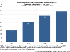 In den letzten Jahrzehnten ist mit jedem jüngeren Heiratsjahrgang die Scheidungshäufigkeit angestiegen: Vom Heiratsjahrgang 1960 wurden etwa 15 % der seinerzeit geschlossenen Ehen geschieden. Für den Heiratsjahrgang 1970 traf dieses Schicksal auf jedes vierte Ehepaar zu, für den Jahrgang 1980 bereits auf jede dritte Ehe. Von den Paaren, die 1995 den Bund der Ehe eingingen, waren bis zum Jahr 2016 – also nach 22 Ehejahren – bereits 34 % geschieden. Die Prognose für diesen Heiratsjahrgang läuft auf eine Scheidungshäufigkeit von knapp 40 % hinaus.2 Damit hat sich die Scheidungshäufigkeit jüngerer Heiratsjahrgänge im Vergleich zu den Ehen aus den 1960er-Jahren mehr als verdoppelt.