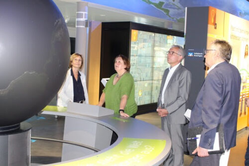 Seit dem 12. Mai 2021 ist Theresa Schopper Ministerin für Kultus, Jugend und Sport in Baden-Württemberg. Nun besuchte die Ministerin, nach dem bereits ein für Ende Januar geplantes Treffen Corona bedingt ausfallen musste, am 1. Juni 2022 die KLIMA ARENA. Mit ausreichend Zeit „im Gepäck“ konnten der Vorstandsvorsitzende der KLIMA ARENA Dr. Bernd Welz, der Vorstand Christian Ledig sowie der Landrat des Rhein-Neckar-Kreises Stefan Dallinger die Ministerin vor Ort begrüßen. Nachdem sich Frau Schopper im Eingangsbereich die Zeit nahm, mit einer Lehrkraft aus Weinheim über den Besuch seiner Klasse in der KLIMA ARENA auszutauschen, informierte sie sich im Anschluss in der Ausstellung an den zahlreichen interessanten Exponaten nicht nur ausführlich über die Grundlagen des Klimawandels, mit großem Interesse erkundete sie auch das interaktiv gestaltete Informationsangebot zu den Bereichen Wohnen und Energie, Mobilität und Lebensstile und Konsum. Im Detail ließ sie sich dabei nicht nur erklären, welche Angebote es für Lehrkräfte gibt, die Themen Nachhaltigkeit und Klimaschutz in den Unterricht zu integrieren, sondern auch, wie Schüler*innen die umfangreichen Informationen bedarfsgerecht, digital und interaktiv vermittelt werden.