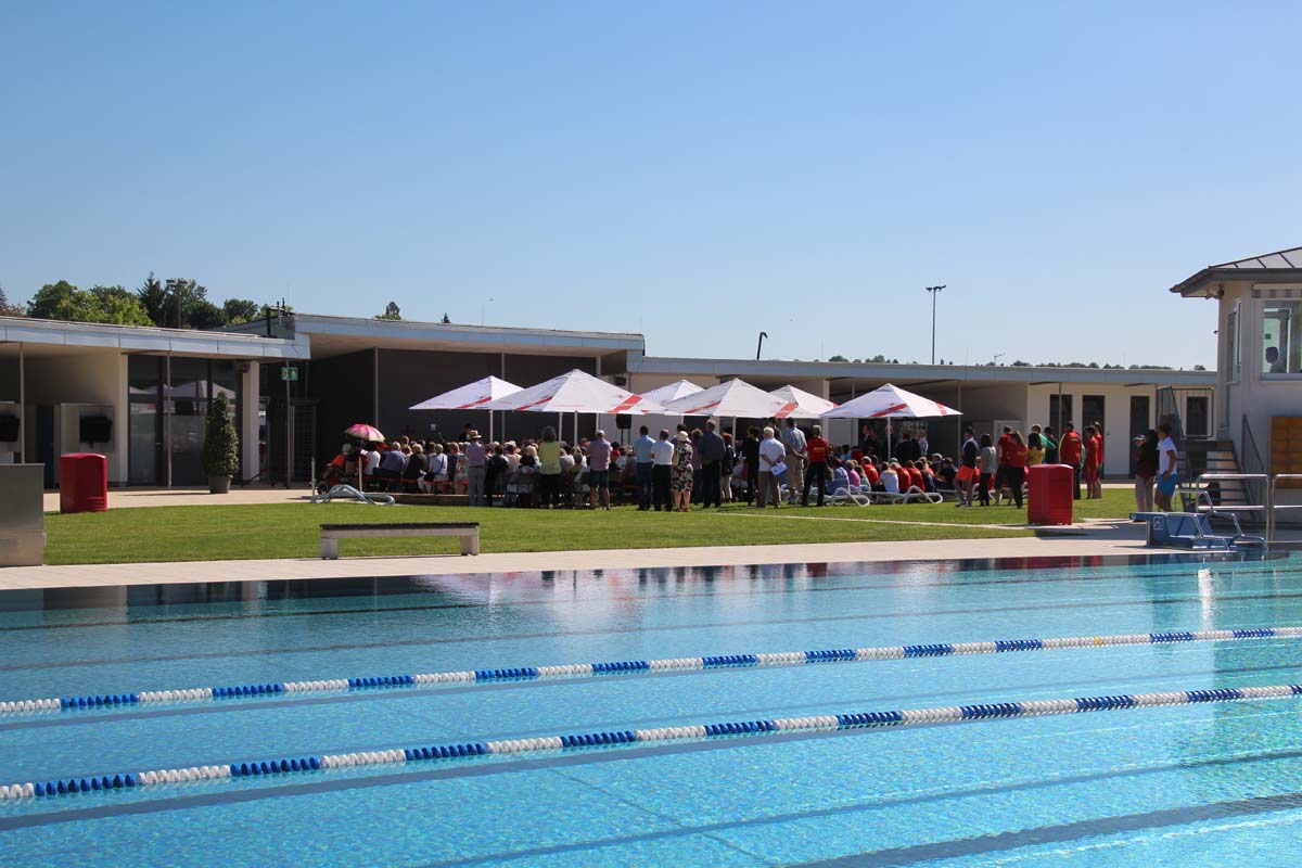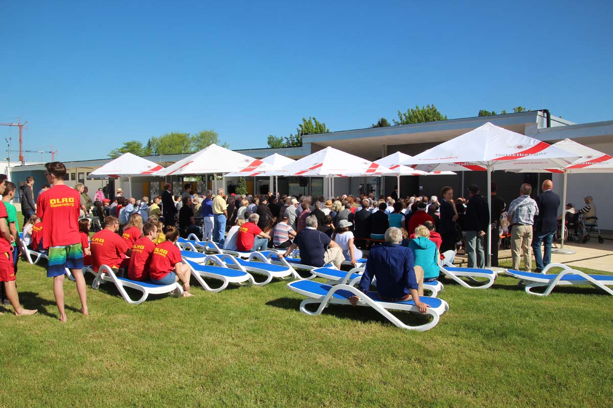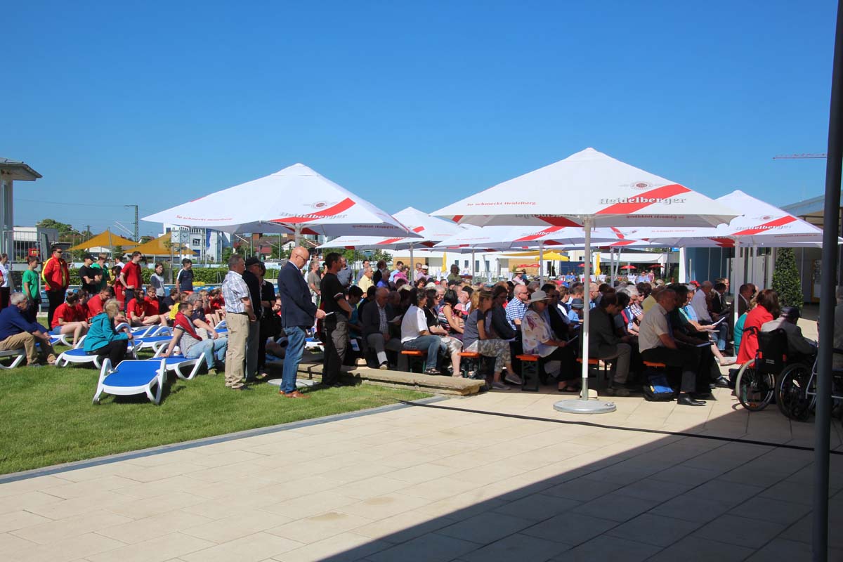 Der Platzeinweihung ist bei strahlendem Sonnenschein ein ökumenischer Gottesdienst mit der Segnung des Bades vorausgegangen. Die evangelische und katholische Kirchengemeinde und die Mennoniten gestalteten den Gottesdienst mit Liedern und Gebeten unter dem Motto „Wasser schenkt Leben!“. Jörg Albrecht dankte für die Unterstützung, die von Seiten der Bundes- und Landespolitik erfolgte und dem Gemeinderat für das kooperative Miteinander. Nicht unerwähnt ließ Albrecht in seinem Grußwort die Initiative seines Vorgängers im Amt für die Sanierung des Freibades.