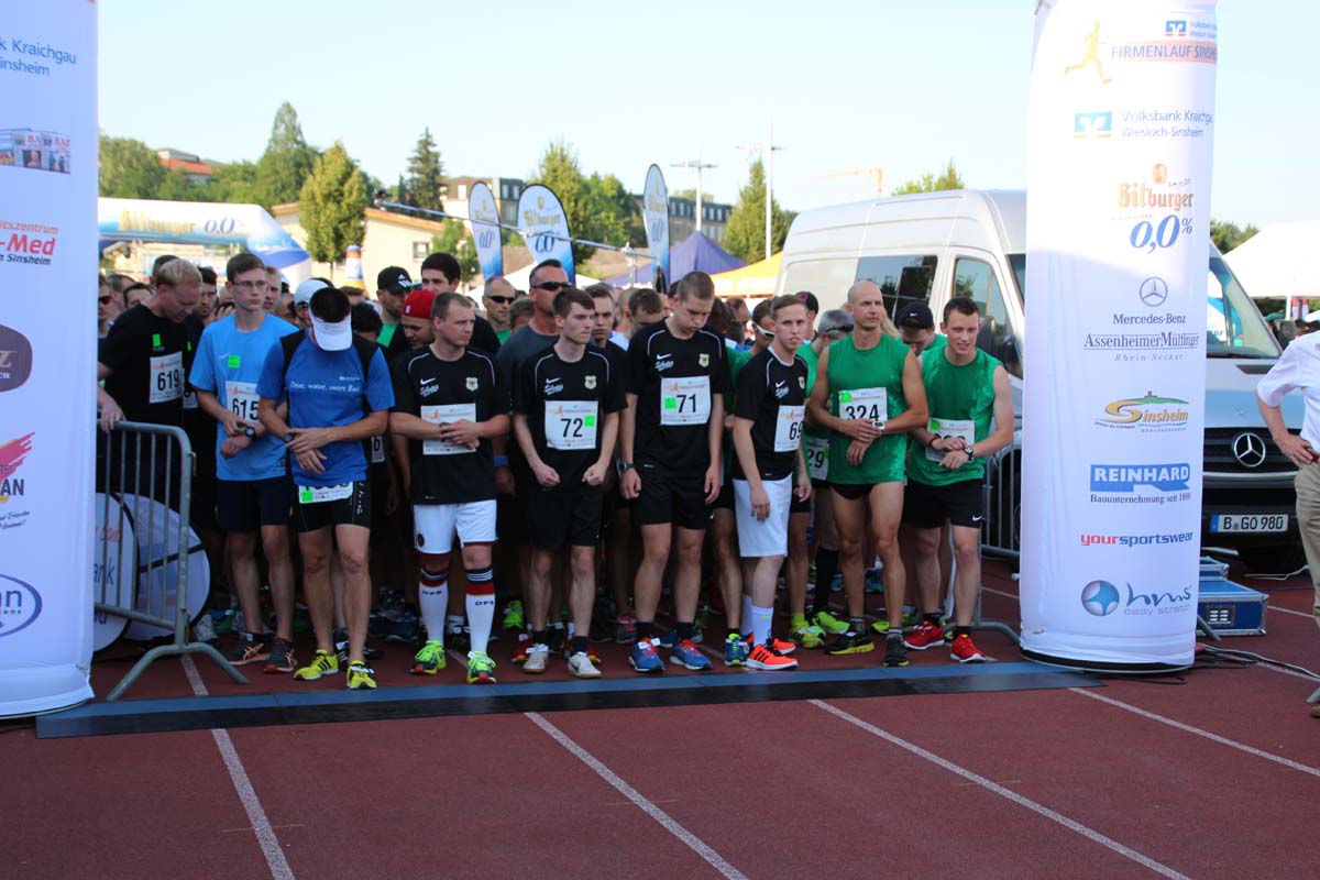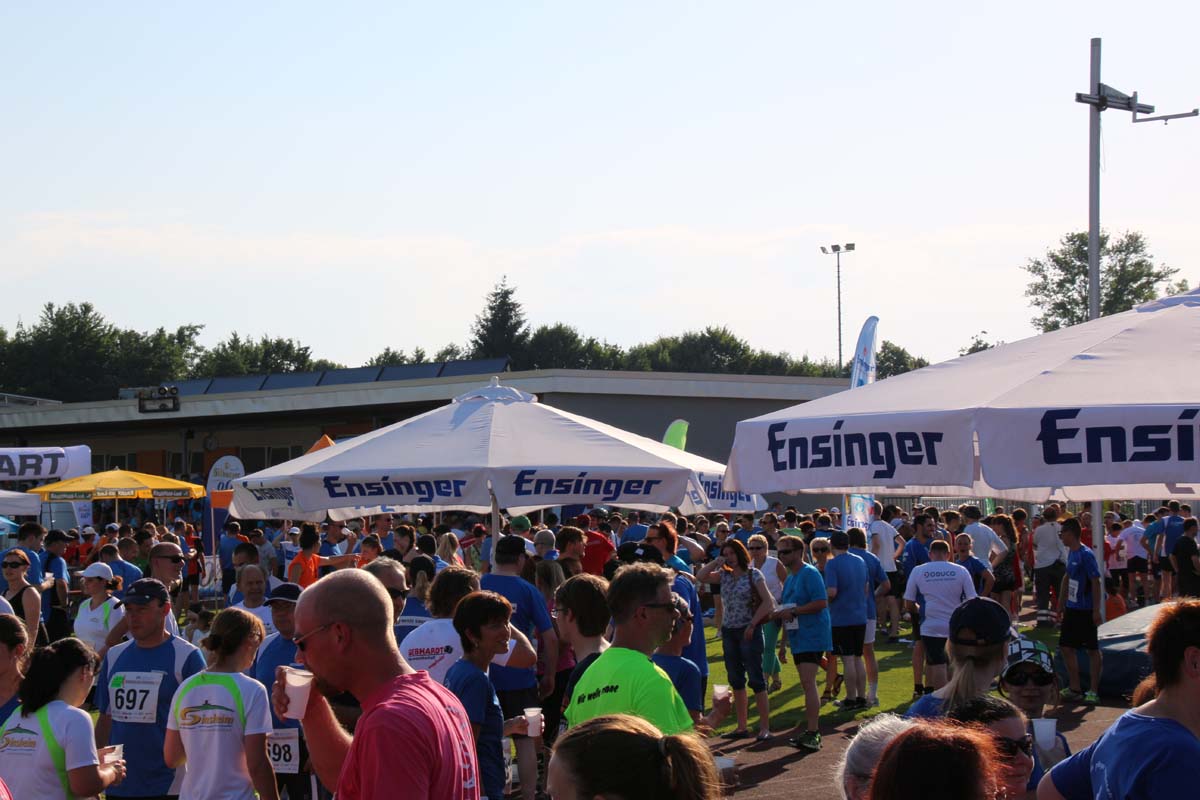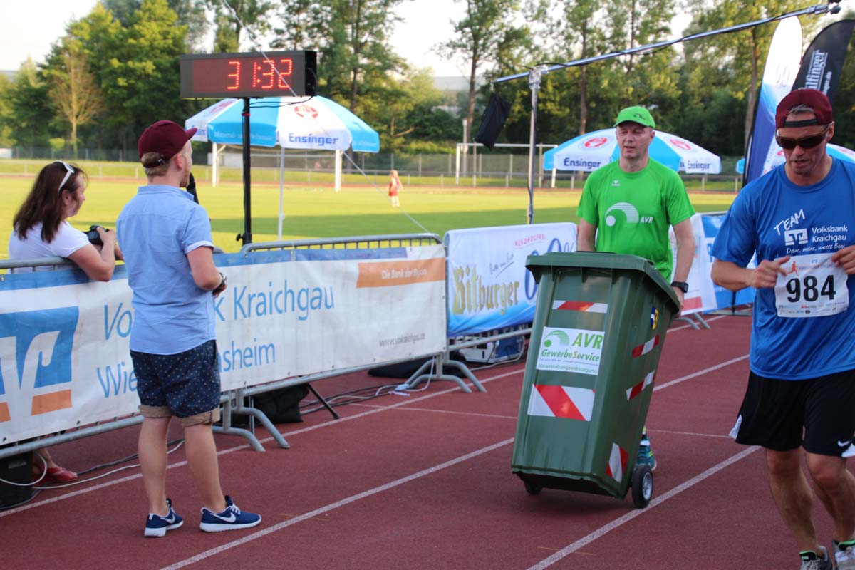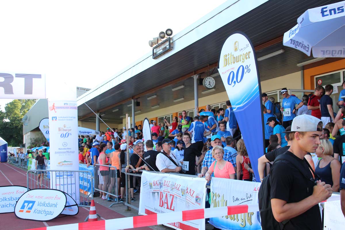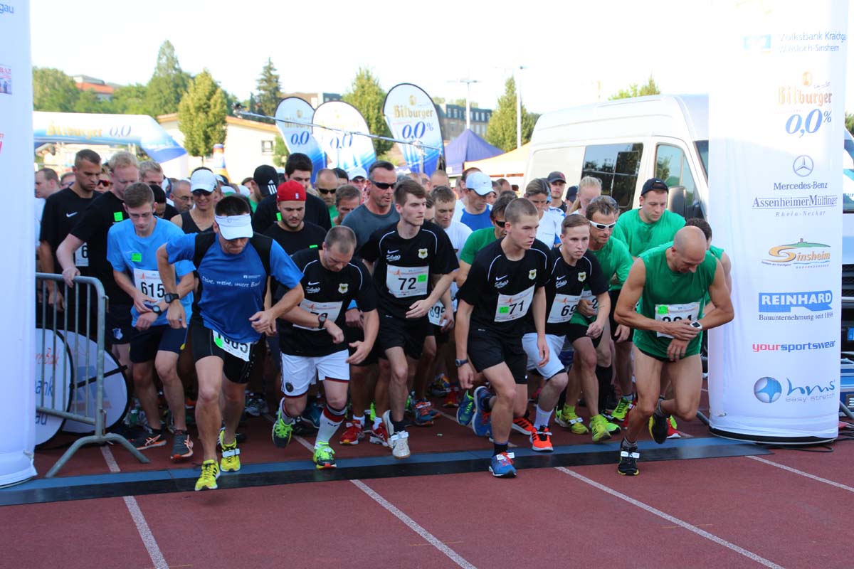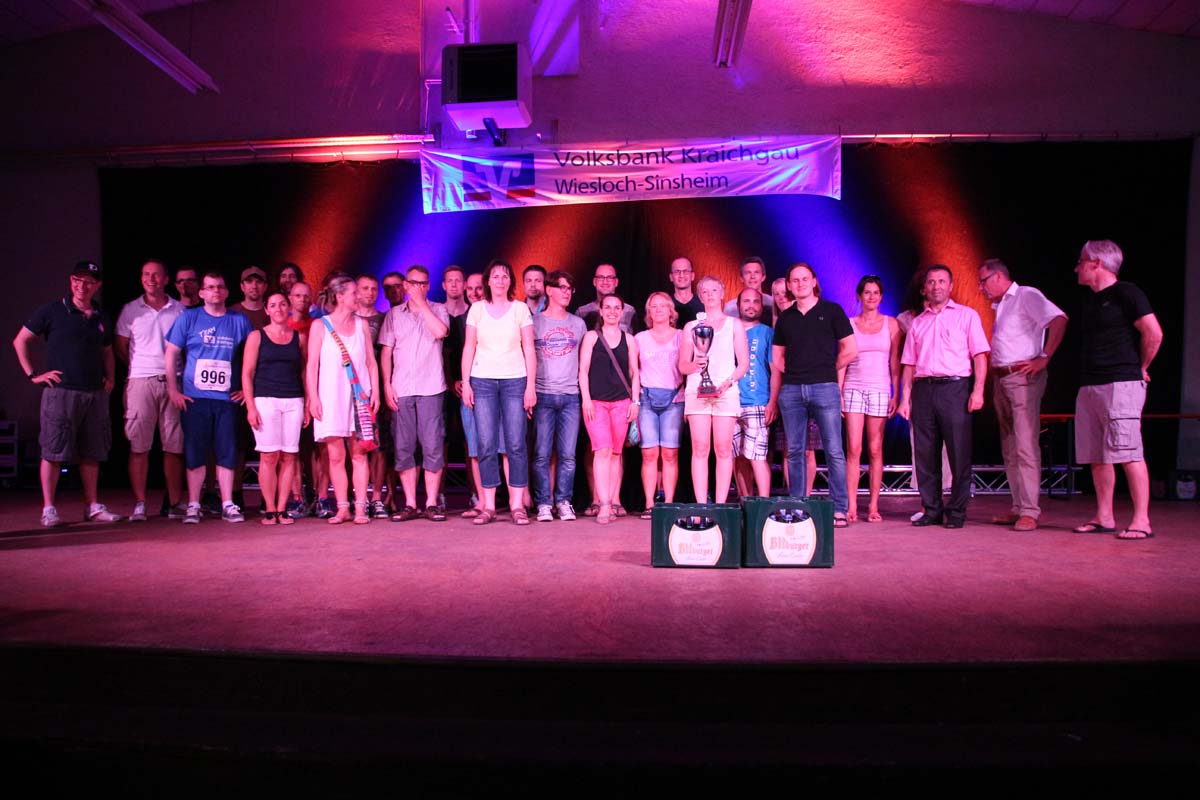 (cr) Glühender Asphalt unter den Füssen und trotzdem jede Menge Spass hatten die Teilnehmer beim diesjährigen Volksbank Firmenlauf mit einer neuen Rekordbeteiligung von fast 1200 Läuferinnen und Läufer. Mit Bitburger und Ensinger wurde aber auch kräftig für den Flüssigkeitshaushalt der Teilnehmer gesorgt, die Bäckerei Rutz steuerte frische Laugenstangen dazu. Für Abkühlung sorgte ein kleiner Pool schon im Vorfeld. Beim Reha Med Team konnte man sich vor und auch nach dem Lauf massieren lassen. Fast pünktlich um 19.00 Uhr fiel der Startschuss und einige Teilnehmer waren auch wieder sehr kreativ. Das Rutz Team lief mit einem riesigen Baguette, die Feuerwehr aus Weiler mit Schutzausrüstung, oder die AVR mit der grünen Tonne. Es war schon beeindruckend mit welchem Ehrgeiz viele Läufer eine Zeit von unter 20 Minuten schaffte. Für zwei Teilnehmer war es dann doch etwas zu viel und mussten vom DRK versorgt werden. Das riesige Laufspektakel endete mit einer grossen After Run Party in der Elsenzhalle mit Siegerehrung und Partymusik. Auch in diesem Jahr war die Volksbank mit dem Pokal für die meisten Teilnehmer nicht zu schlagen.