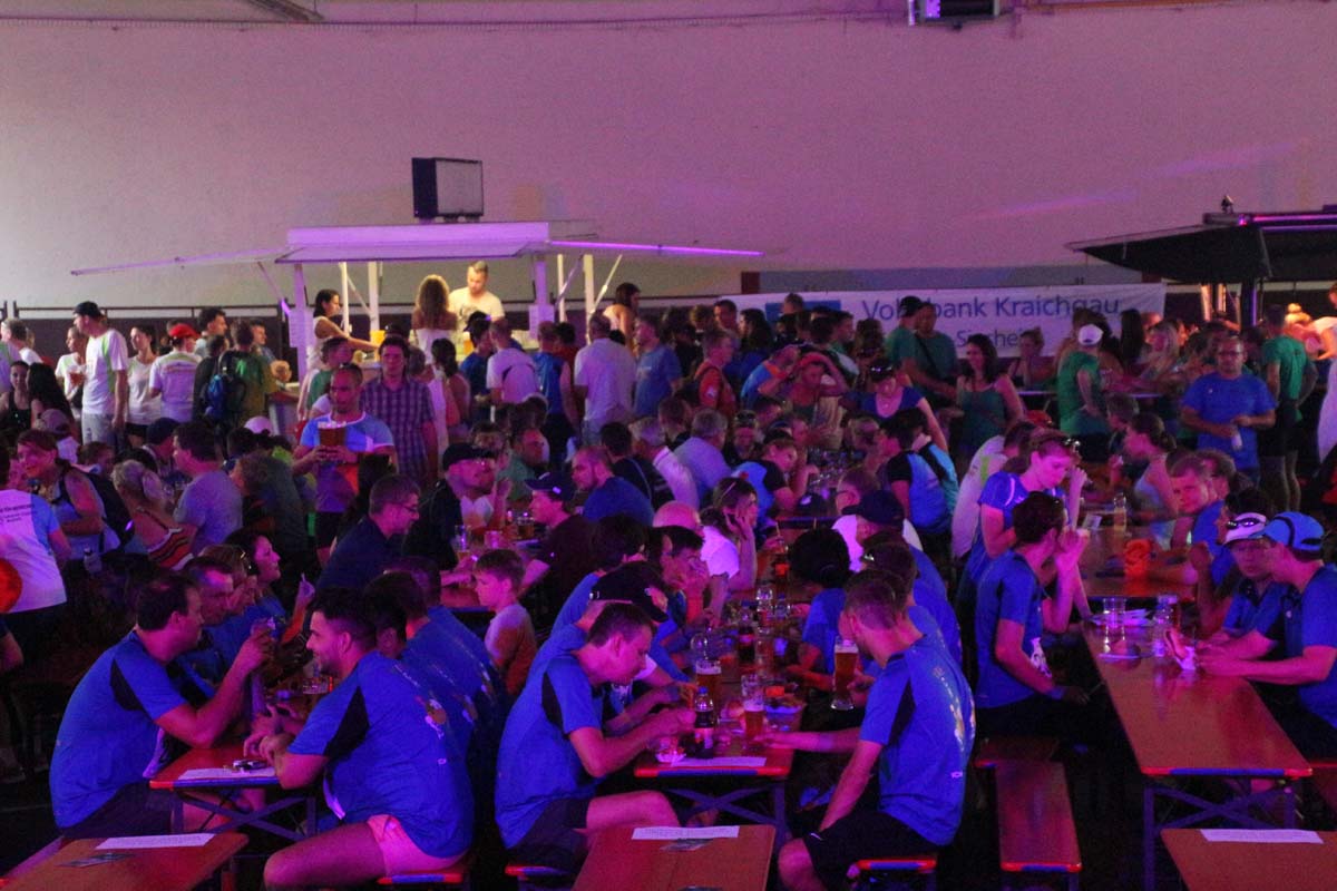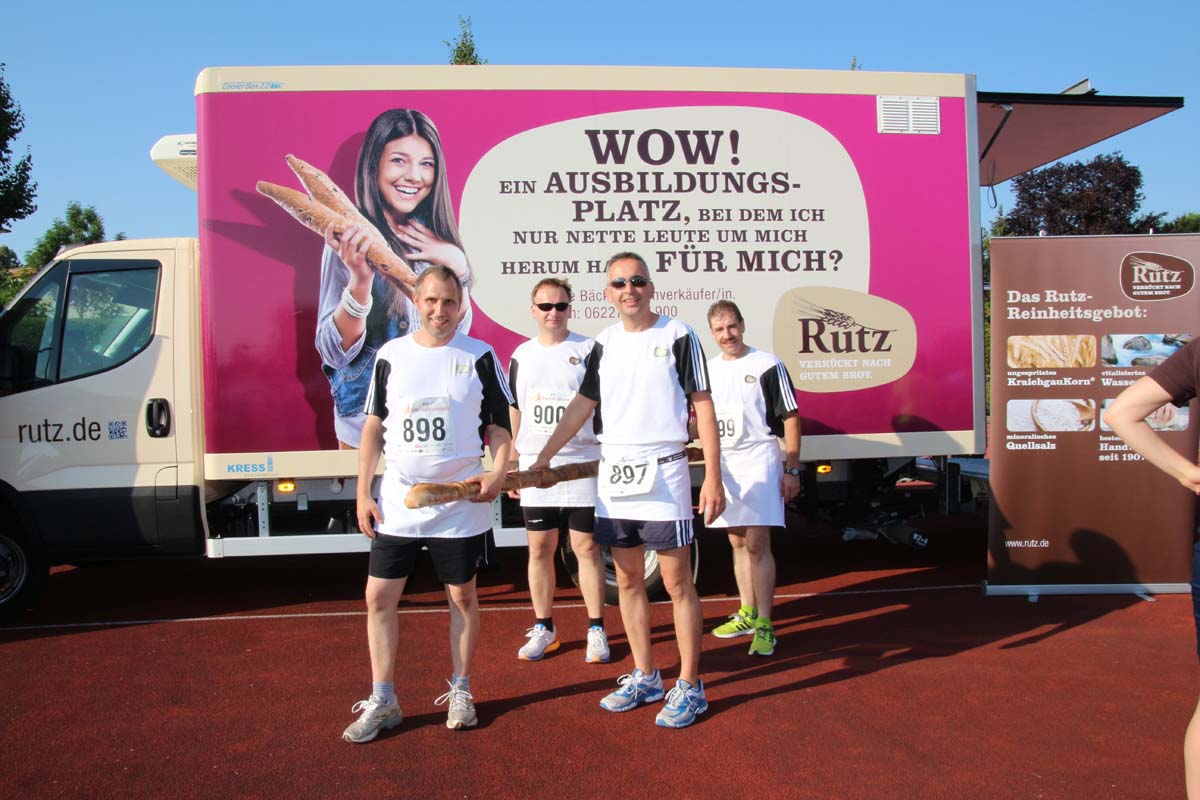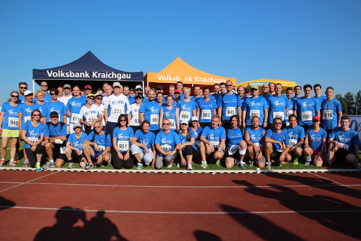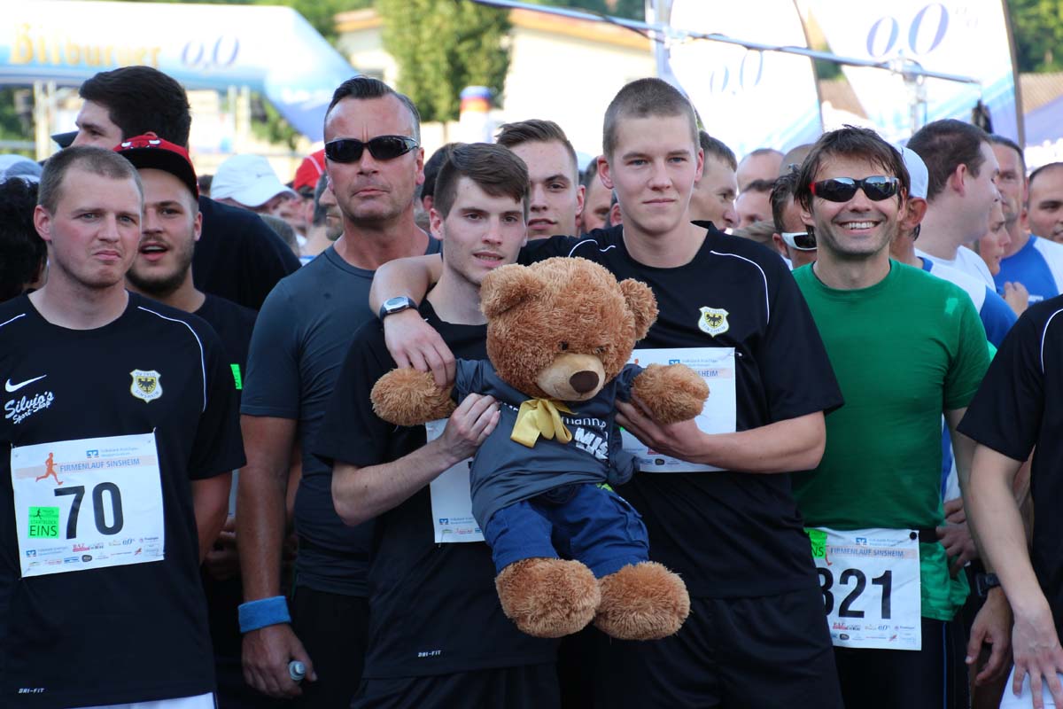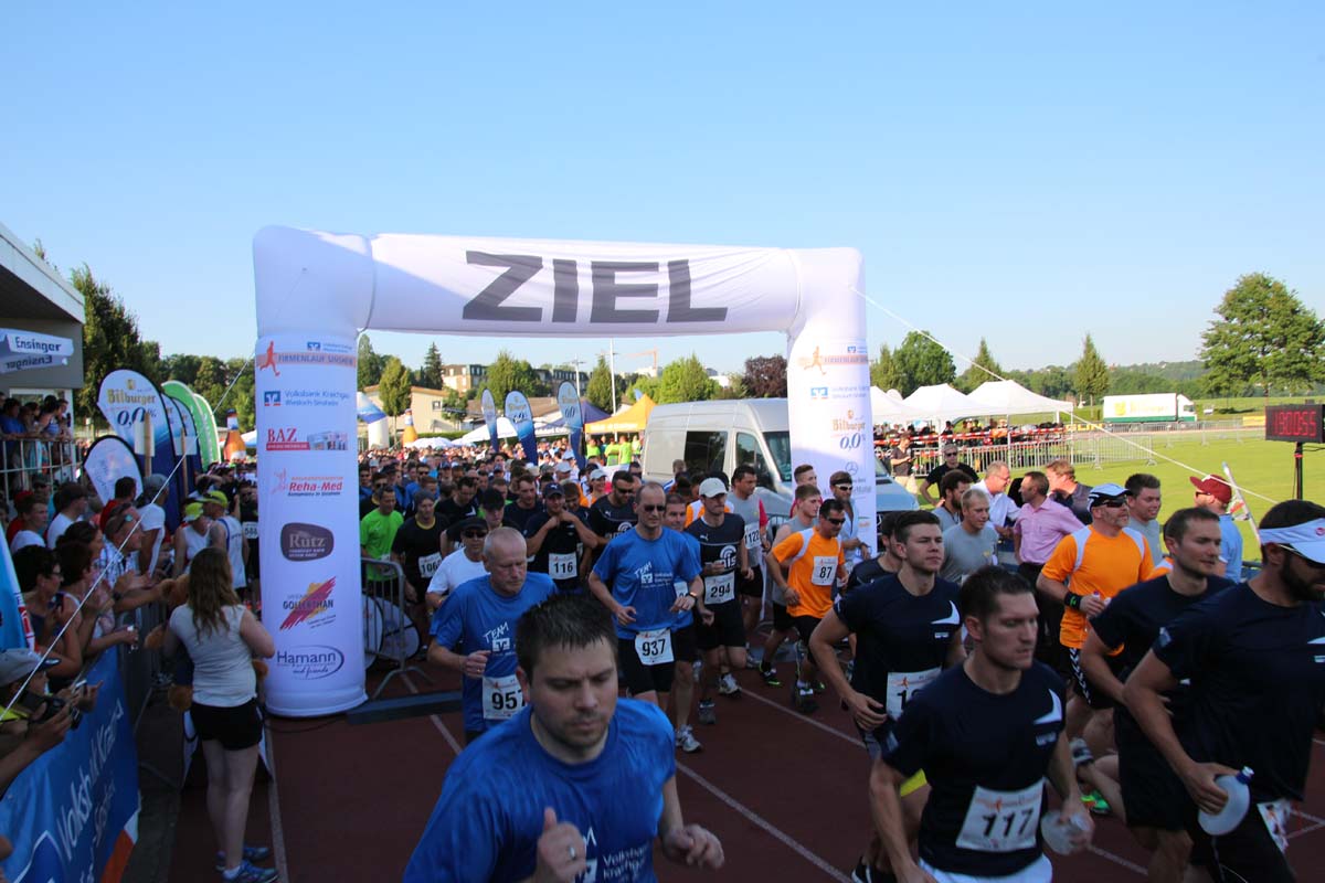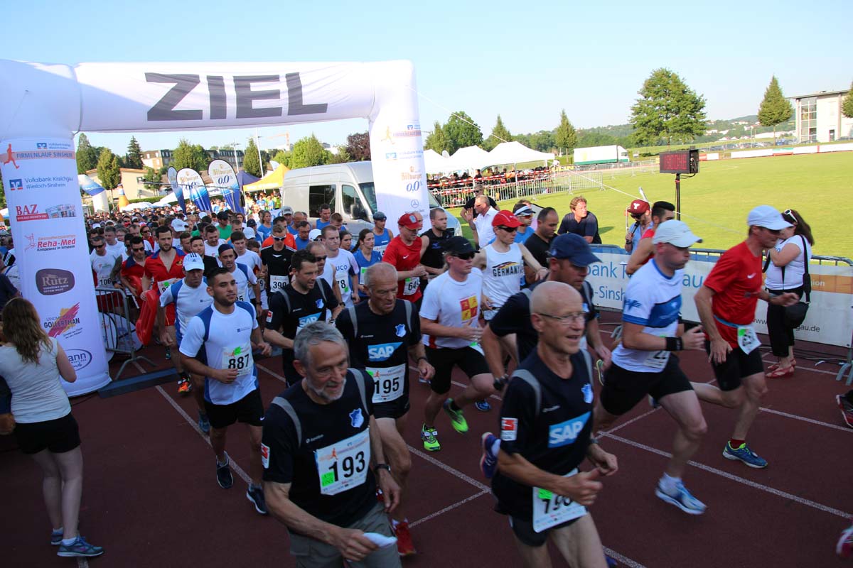 (cr) Glühender Asphalt unter den Füssen und trotzdem jede Menge Spass hatten die Teilnehmer beim diesjährigen Volksbank Firmenlauf mit einer neuen Rekordbeteiligung von fast 1200 Läuferinnen und Läufer. Mit Bitburger und Ensinger wurde aber auch kräftig für den Flüssigkeitshaushalt der Teilnehmer gesorgt, die Bäckerei Rutz steuerte frische Laugenstangen dazu. Für Abkühlung sorgte ein kleiner Pool schon im Vorfeld. Beim Reha Med Team konnte man sich vor und auch nach dem Lauf massieren lassen. Fast pünktlich um 19.00 Uhr fiel der Startschuss und einige Teilnehmer waren auch wieder sehr kreativ. Das Rutz Team lief mit einem riesigen Baguette, die Feuerwehr aus Weiler mit Schutzausrüstung, oder die AVR mit der grünen Tonne. Es war schon beeindruckend mit welchem Ehrgeiz viele Läufer eine Zeit von unter 20 Minuten schaffte. Für zwei Teilnehmer war es dann doch etwas zu viel und mussten vom DRK versorgt werden. Das riesige Laufspektakel endete mit einer grossen After Run Party in der Elsenzhalle mit Siegerehrung und Partymusik. Auch in diesem Jahr war die Volksbank mit dem Pokal für die meisten Teilnehmer nicht zu schlagen.