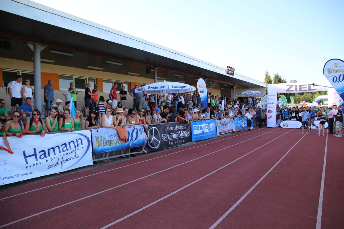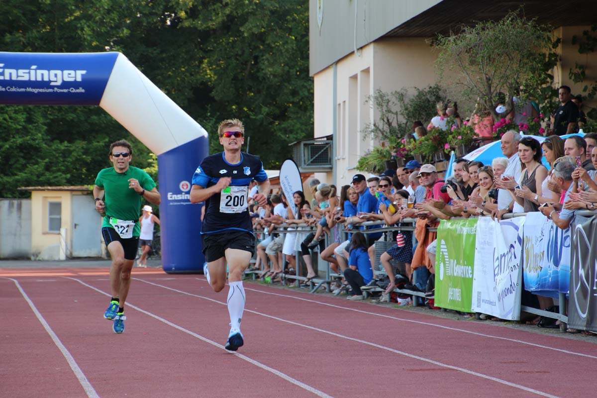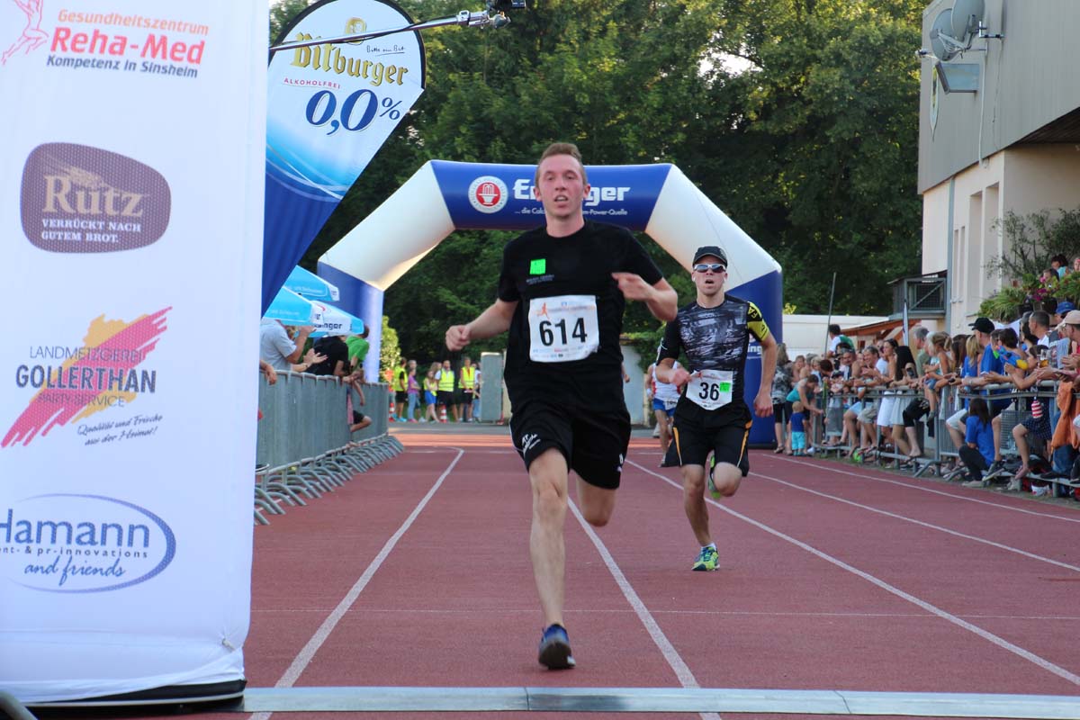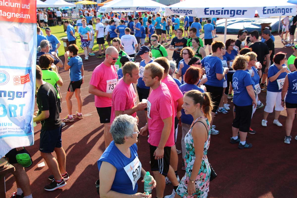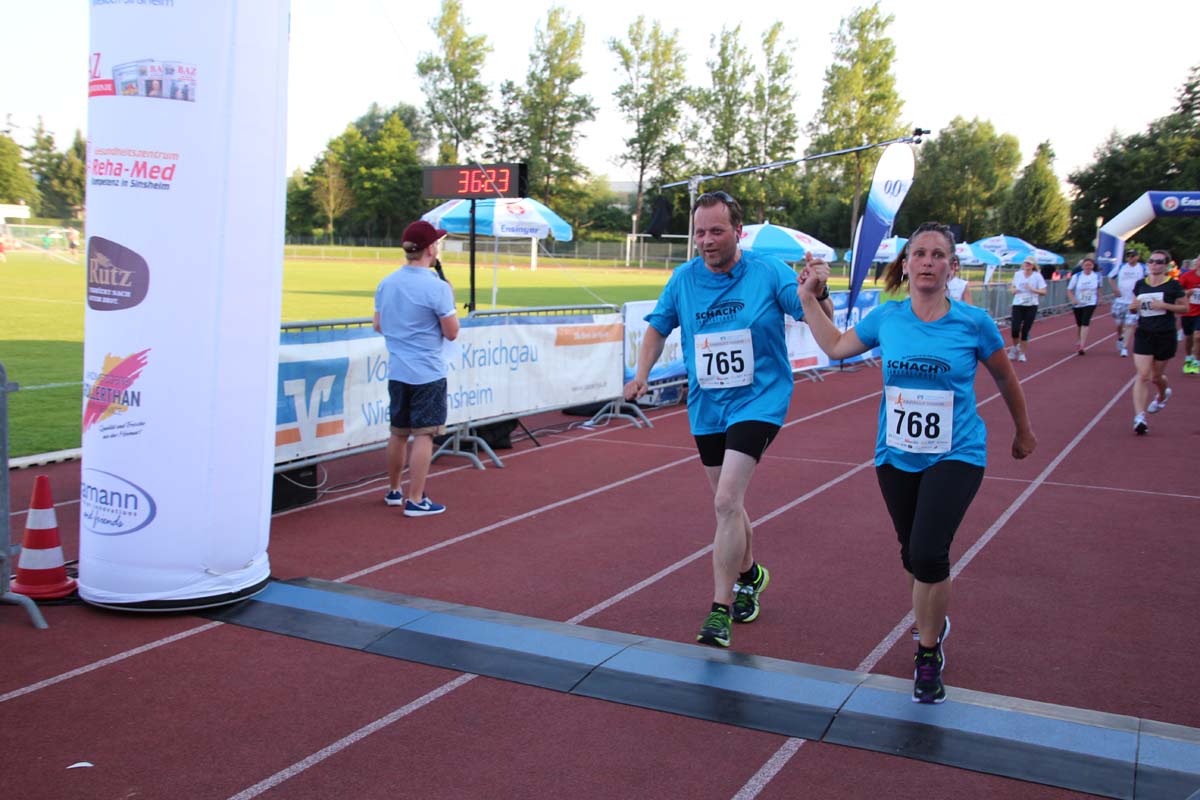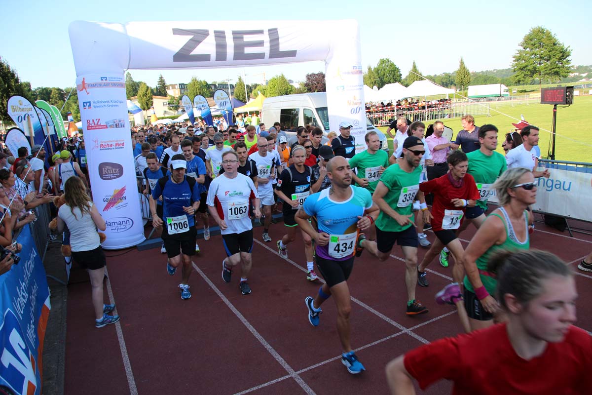 (cr) Glühender Asphalt unter den Füssen und trotzdem jede Menge Spass hatten die Teilnehmer beim diesjährigen Volksbank Firmenlauf mit einer neuen Rekordbeteiligung von fast 1200 Läuferinnen und Läufer. Mit Bitburger und Ensinger wurde aber auch kräftig für den Flüssigkeitshaushalt der Teilnehmer gesorgt, die Bäckerei Rutz steuerte frische Laugenstangen dazu. Für Abkühlung sorgte ein kleiner Pool schon im Vorfeld. Beim Reha Med Team konnte man sich vor und auch nach dem Lauf massieren lassen. Fast pünktlich um 19.00 Uhr fiel der Startschuss und einige Teilnehmer waren auch wieder sehr kreativ. Das Rutz Team lief mit einem riesigen Baguette, die Feuerwehr aus Weiler mit Schutzausrüstung, oder die AVR mit der grünen Tonne. Es war schon beeindruckend mit welchem Ehrgeiz viele Läufer eine Zeit von unter 20 Minuten schaffte. Für zwei Teilnehmer war es dann doch etwas zu viel und mussten vom DRK versorgt werden. Das riesige Laufspektakel endete mit einer grossen After Run Party in der Elsenzhalle mit Siegerehrung und Partymusik. Auch in diesem Jahr war die Volksbank mit dem Pokal für die meisten Teilnehmer nicht zu schlagen.