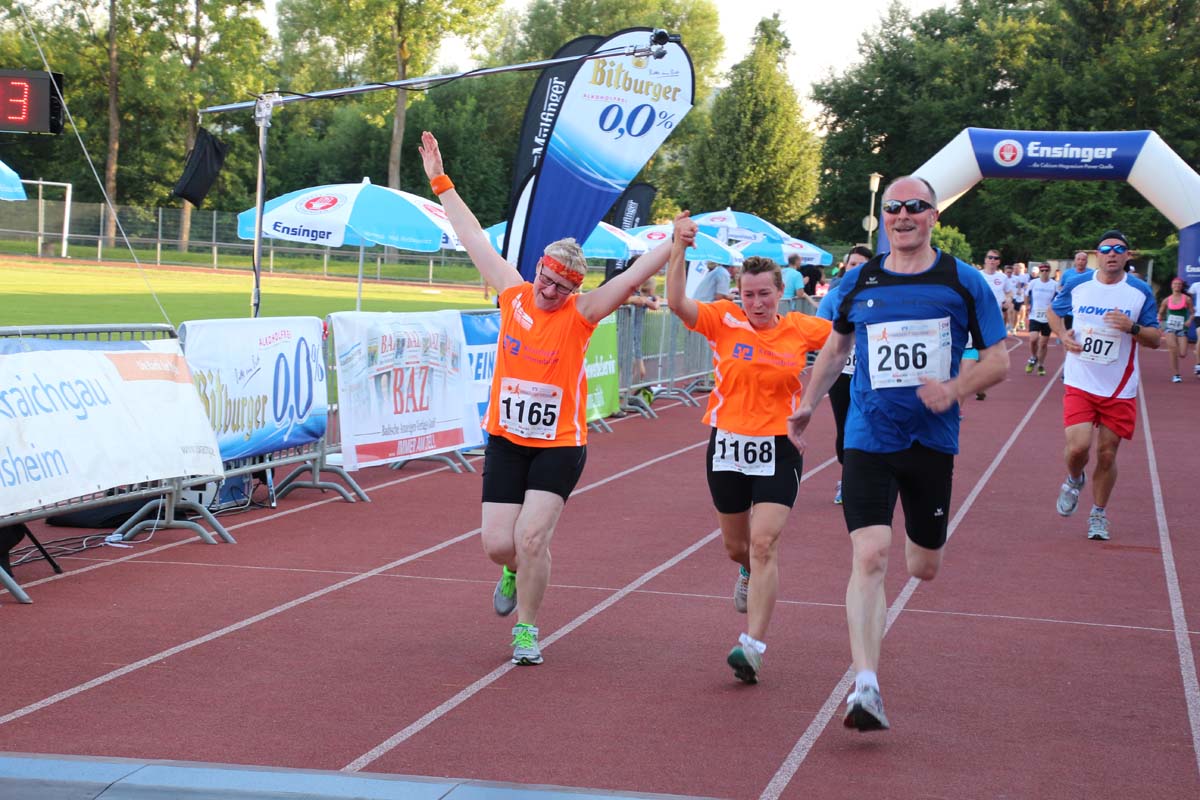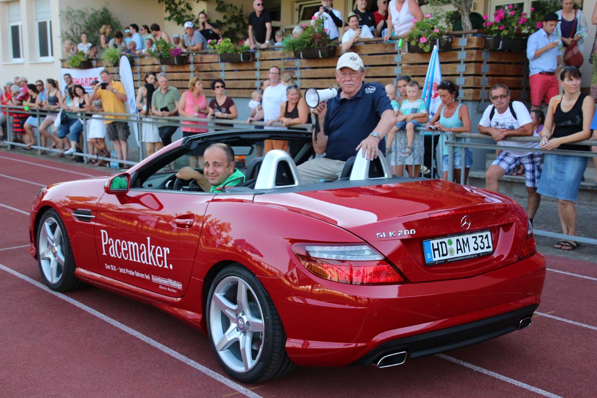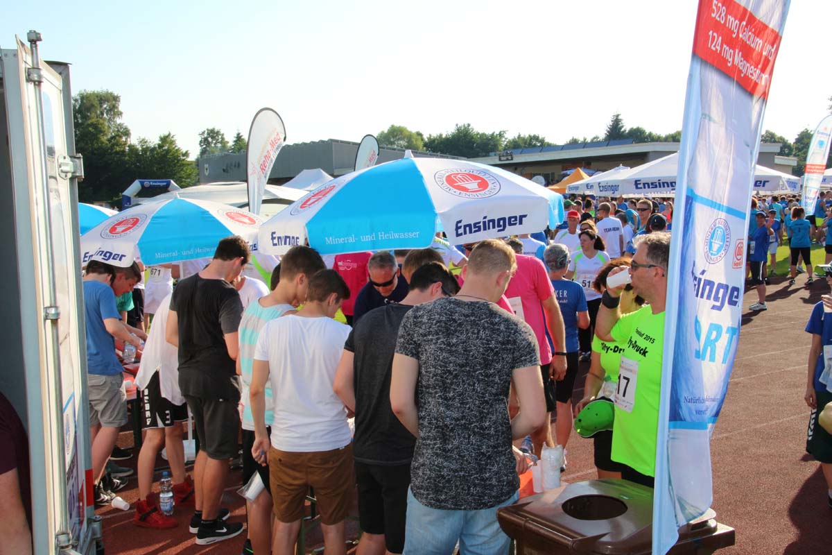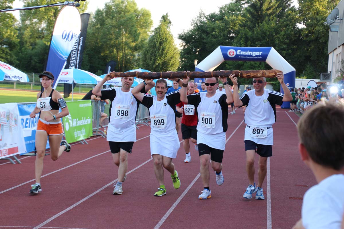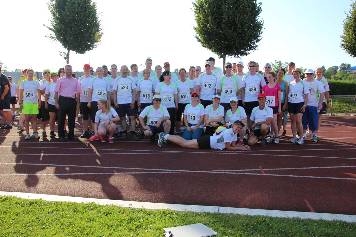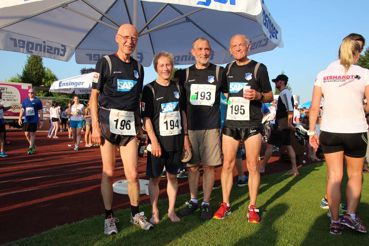 (cr) Glühender Asphalt unter den Füssen und trotzdem jede Menge Spass hatten die Teilnehmer beim diesjährigen Volksbank Firmenlauf mit einer neuen Rekordbeteiligung von fast 1200 Läuferinnen und Läufer. Mit Bitburger und Ensinger wurde aber auch kräftig für den Flüssigkeitshaushalt der Teilnehmer gesorgt, die Bäckerei Rutz steuerte frische Laugenstangen dazu. Für Abkühlung sorgte ein kleiner Pool schon im Vorfeld. Beim Reha Med Team konnte man sich vor und auch nach dem Lauf massieren lassen. Fast pünktlich um 19.00 Uhr fiel der Startschuss und einige Teilnehmer waren auch wieder sehr kreativ. Das Rutz Team lief mit einem riesigen Baguette, die Feuerwehr aus Weiler mit Schutzausrüstung, oder die AVR mit der grünen Tonne. Es war schon beeindruckend mit welchem Ehrgeiz viele Läufer eine Zeit von unter 20 Minuten schaffte. Für zwei Teilnehmer war es dann doch etwas zu viel und mussten vom DRK versorgt werden. Das riesige Laufspektakel endete mit einer grossen After Run Party in der Elsenzhalle mit Siegerehrung und Partymusik. Auch in diesem Jahr war die Volksbank mit dem Pokal für die meisten Teilnehmer nicht zu schlagen.