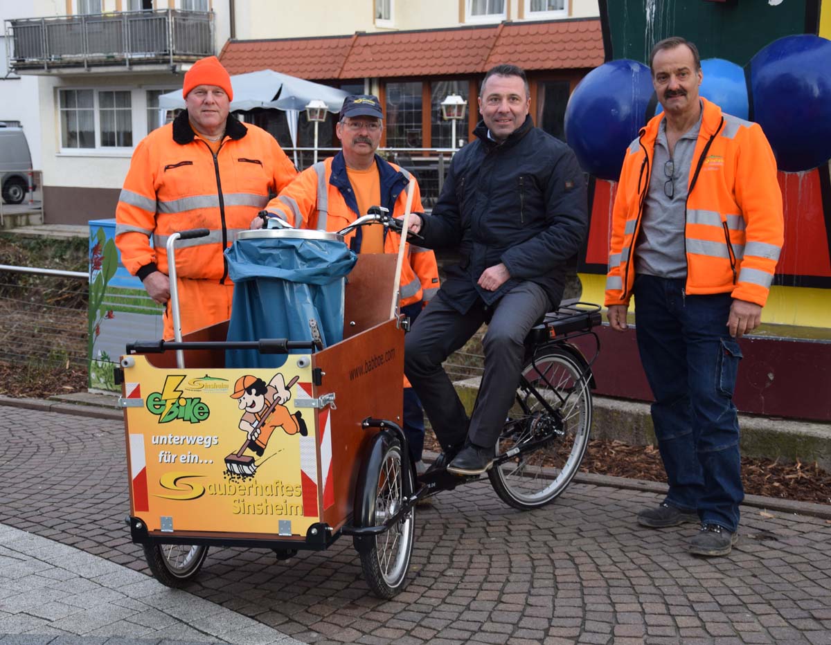 (zg) Bis dato waren die Mitarbeiter des städtischen Bauhofs ausschließlich mit einem Handwagen für die Stadtreinigung unterwegs. Nun hat die Stadtverwaltung zusätzlich ein Lastenfahrrad angeschafft, mit dem die für die Stadtreinigung tätigen Mitarbeiter in Sachen „Sauberhaftes Sinsheim“ mobiler werden und größere Entfernungen leichter zurücklegen können. Das Lastenfahrrad ist ab sofort im Einsatz. Es hat sieben Gänge, Nabenschaltung und E-Unterstützung. Vorne am Lenker ist der zweirädrige Wagen montiert. Ausgestattet mit einer Halterung für den Müllbeutel, Schaufel und Besen. „Eine gute Sache“, findet Oberbürgermeister Jörg Albrecht. „Den größten Unterschied zum normalen Fahrrad merkt man in den Kurven. Man muss einen größeren Wendekreis beachten“, stellte er nach der Probefahrt mit dem neuen Lastenfahrrad fest.