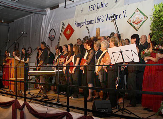Viele Freunde der Chormusik waren nach Weiler gekommen um dem Festbankett der 150 Jahrfeier des Sängerkranz 1862 Weiler beizuwohnen. Die festlich geschmückte Maschinenhalle der Familie Rudy bilden den richtigen festlichen Rahmen für diese Veranstaltung. Begeistert verfolgten die Zuschauer dem kurzweilig gestalteten Festakt des traditionellen Vereines aus Weiler. Mitgestaltet wurde dieser Abend auch von weiteren örtlichen Chören. Am späteren Abend gab es noch Tanzmusik mit dem Basalt-DJ.