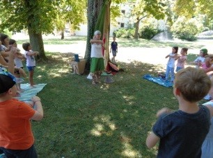 (zg) Beim Kinderferienprogramm „Laufen & Lauschen… mit der Märchenerzählerin“ entführte die ausgebildete Märchenerzählerin Cornelia Tanner vom Märchenteam „Balsam“, für die Kinder bekannt als „Conny“, die neugierigen Kinder mit ihren Erzählungen in eine märchenhafte Welt. Ihre mitgebrachten Geschichten waren getreu ihrem Motto „Balsam für die Seele“. Nach dem Begrüßungsspiel und dem Märchenraten durften die knapp 25 Kinder im Grundschulalter der Geschichte lauschen wie die Märchen auf die Welt kamen. Nachdem sie darüber nun Bescheid wussten erzählte Cornelia Tanner auswendig und innig ferner wie das Feuer entstand und warum die Raben schwarz sind. Es wurden hierbei keine bereits bekannten Gebrüder-Grimm-Märchen erzählt, sondern beispielsweise afrikanische Märchen, wie das Märchen „Die Maismutter“. Frau Tanner war mit viel Engagement und Herzblut bei der Sache und schaffte es so die Kinder für das alte Kulturgut begeistern.