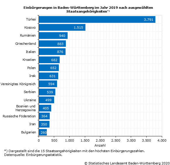 Im vergangenen Jahr wurden in Baden-Württemberg Ausländerinnen und Ausländer aus insgesamt 149 Nationen eingebürgert. Dabei entfielen gut zwei Drittel (67,9 %) der Einbürgerungen auf die 15 häufigsten Herkunftsstaaten und knapp ein Fünftel (19,8 %) allein auf die Türkei. Besonders häufig waren zudem Einbürgerungen von kosovarischen Staatsangehörigen (1 515). Der Irak (631) und der Iran (350) waren unter den 15 Herkunftsstaaten mit der höchsten Zahl an Einbürgerungen die einzigen beiden nichteuropäischen Länder.