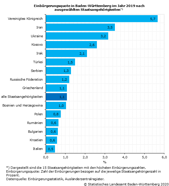Das derzeit hohe Interesse der im Land lebenden Britinnen und Briten am Erwerb der deutschen Staatsbürgerschaft zeigt sich auch an der höchsten Einbürgerungsquote (5,7 %) im Vergleich der 15 häufigsten Herkunftsstaaten1. Abgesehen vom im Berichtsjahr 2019 noch zur EU zählenden Vereinigten Königreich weisen alle EU-Mitgliedsstaaten eine durchschnittliche (Griechenland) oder unter dem Durchschnitt von 1,1 % liegende Einbürgerungsquote auf. Im Gegensatz dazu werden in Baden-Württemberg lebende Personen aus Nicht-EU-Staaten im Verhältnis zur jeweiligen Bevölkerungsgruppe deutlich häufiger eingebürgert. Einbürgerungsquoten über 2 % weisen die Staaten Iran (3,5 %), Ukraine (3,2 %), Kosovo (2,6 %) und Irak (2,1 %) auf. Auch die Einbürgerungsquote der Türkei (1,5 %) liegt über dem Durchschnitt.