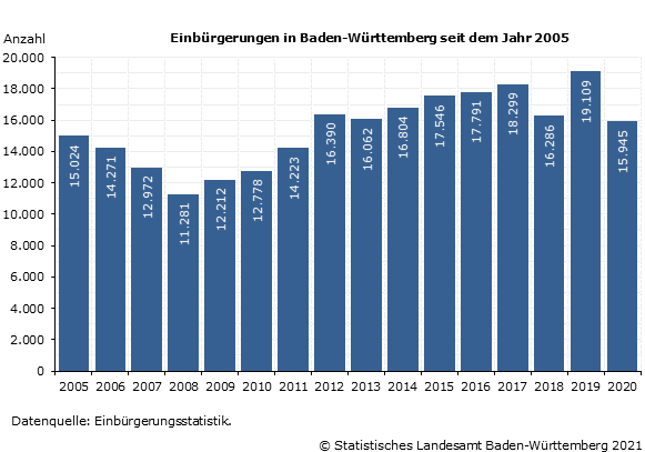 In Baden-Württemberg wurden im Verlauf des Jahres 2020 insgesamt 15 945 Ausländerinnen und Ausländer eingebürgert. Weniger Einbürgerungen innerhalb eines Jahres hatte es nach Angaben des Statistischen Landesamtes zuletzt 2011 gegeben. Gegenüber dem im Vorjahr 2019 verzeichneten Höchststand (19 109) ist die Zahl der Einbürgerungen um rund 3 200 oder 17 % gesunken1. Es wurden geringfügig mehr Frauen (52,9 %) eingebürgert als Männer. Der Anteil der Minderjährigen unter den Eingebürgerten beträgt 13,9 % und ist damit geringer als im Vorjahr (16,7 %).