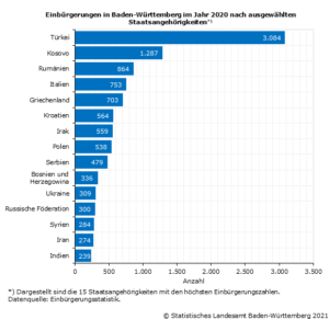 Im vergangenen Jahr wurden in Baden-Württemberg Ausländerinnen und Ausländer aus insgesamt 139 Nationen eingebürgert. Dabei entfielen knapp zwei Drittel (66,3 %) der Einbürgerungen auf die 15 häufigsten Herkunftsstaaten. Am häufigsten waren wie auch im Jahr 2019 Einbürgerungen von türkischen (3 084), kosovarischen (1 287) und rumänischen (864) Staatsangehörigen.