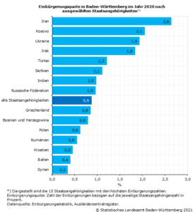 Unter den 15 häufigsten Herkunftsstaaten zeigt sich, dass die Einbürgerungsquote bei EU-Mitgliedsstaaten durchweg unter dem Durchschnitt von 0,9 % liegt. Dies deutet darauf hin, dass Rechte von EU-Bürgern wie Reisefreiheit, Freizügigkeit und das Stimmrecht bei Europa- und Kommunalwahlen den Schritt der Einbürgerung für diese in manchen Fällen verzichtbar machen. Umgekehrt weisen alle Drittstaaten außer Syrien und Bosnien-Herzegowina eine überdurchschnittliche Quote auf. Die höchsten Einbürgerungsquoten im Jahr 2020 erreichen die Herkunftsstaaten Iran (2,6 %), Kosovo (2,1 %), Ukraine (1,9 %) und Irak (1,8 %).
