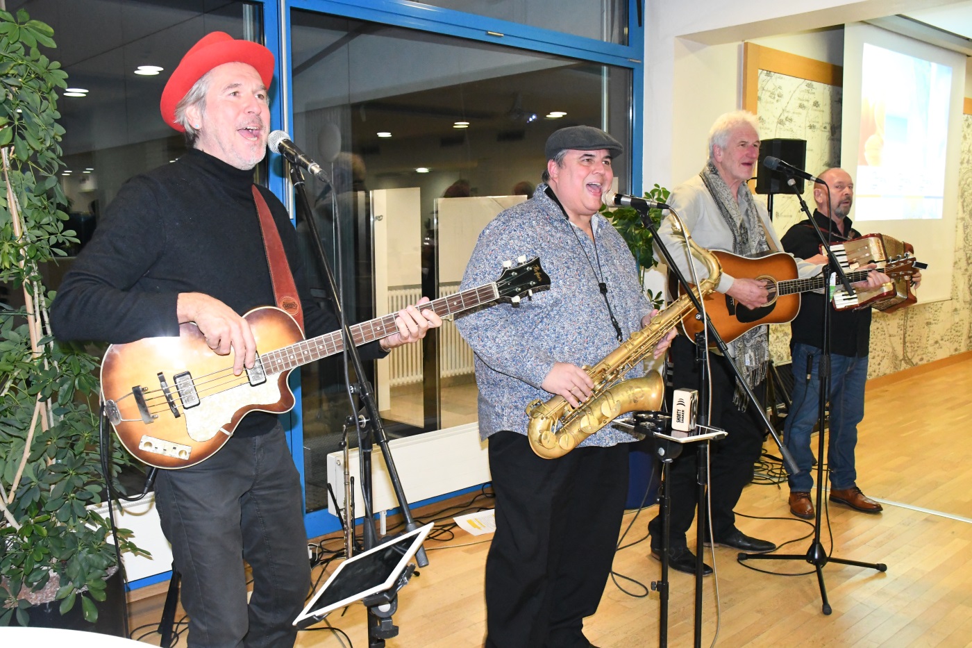 Am Schluss des offiziellen Parts überraschte das GRN-Küchenteam, das mit leckeren mediterranen Speisen und kühlen Getränken für das leibliche Wohl der Gäste sorgte, mit einer großen Torte, Wunderkerzen und darauf ein Freizeitfoto von Rüdiger Burger. Mitarbeitende aus den GRN-Einrichtungen richteten Grüße per Video-Botschaft und die Freddy-Wonder-Combo hatte zwischendurch immer wieder mit Stücken wie „An Tagen wie diesen“, im Original von den Toten Hosen, für gute Atmosphäre gesorgt und unterhielt die Gäste auch nach dem offiziellen Part noch mit rockigen Musikstücken und dem richtigen Gespür für exzellenten Sound in passender Lautstärke. „Wenn ich es mir hätte aussuchen dürfen“, sagte der Ehrengastgeber des Tages, „wäre das meine erste Musikwahl gewesen“.