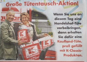(cr) Eigentlich war die Werbeaktion von Kaufland eine tolle Idee. Man sollte am Donnerstag eine alte Handelshoftüte bringen, und dafür eine prall gefüllte Kauflandtüte kostenlos bekommen. So wurde in den Haushalten schnell nach alten Tüten gesucht und auch gefunden. Was in der Werbung nicht stand, jedoch bereits am Eingang der Firma Kaufland zu lesen war, es gibt nur eine Tüte pro Haushalt. Dies ist noch einigermaßen zu verstehen. Jedoch von prall gefüllt, wie versprochen, und auf dem Bild im Prospekt zu sehen, konnte nicht die Rede sein. In Bad Rappenau war die Tüte gerade mal zur Hälfte mit 5 Produkten gefüllt und in Sinsheim mit 4 Produkten davon noch weit entfernt. Über die Auswahl der Artikel darf man nicht meckern, dies ist nun Sache des Werbeträgers. Aber enttäuscht waren die Tauschfreudigen schon etwas, hatte man auf Grund der Werbung wesentlich mehr erwartet. Die ganze Aktion sollte bis 20.00 Uhr gehen. In Sinsheim gingen jedoch ab ca 17.00 Uhr die Tüten aus. Zur freudigen Überraschung der späteren Teilnehmer dieser Werbeaktion bekamen diese anstatt einer halbvollen Tüte einen Gutschein über 10 Euro. Dies finden wir wiederum absolut fair, hätte ja auch am Eingang stehen können „Nur solange der Vorrat reicht“.