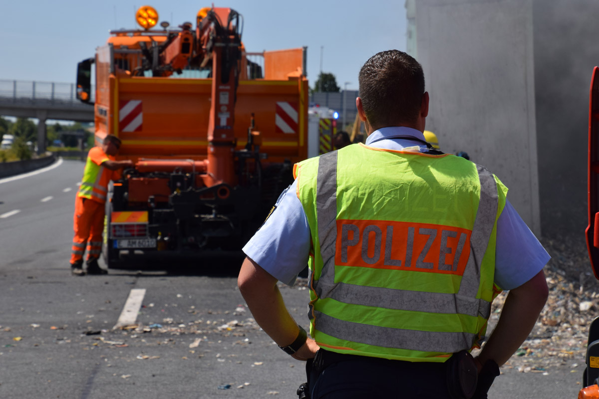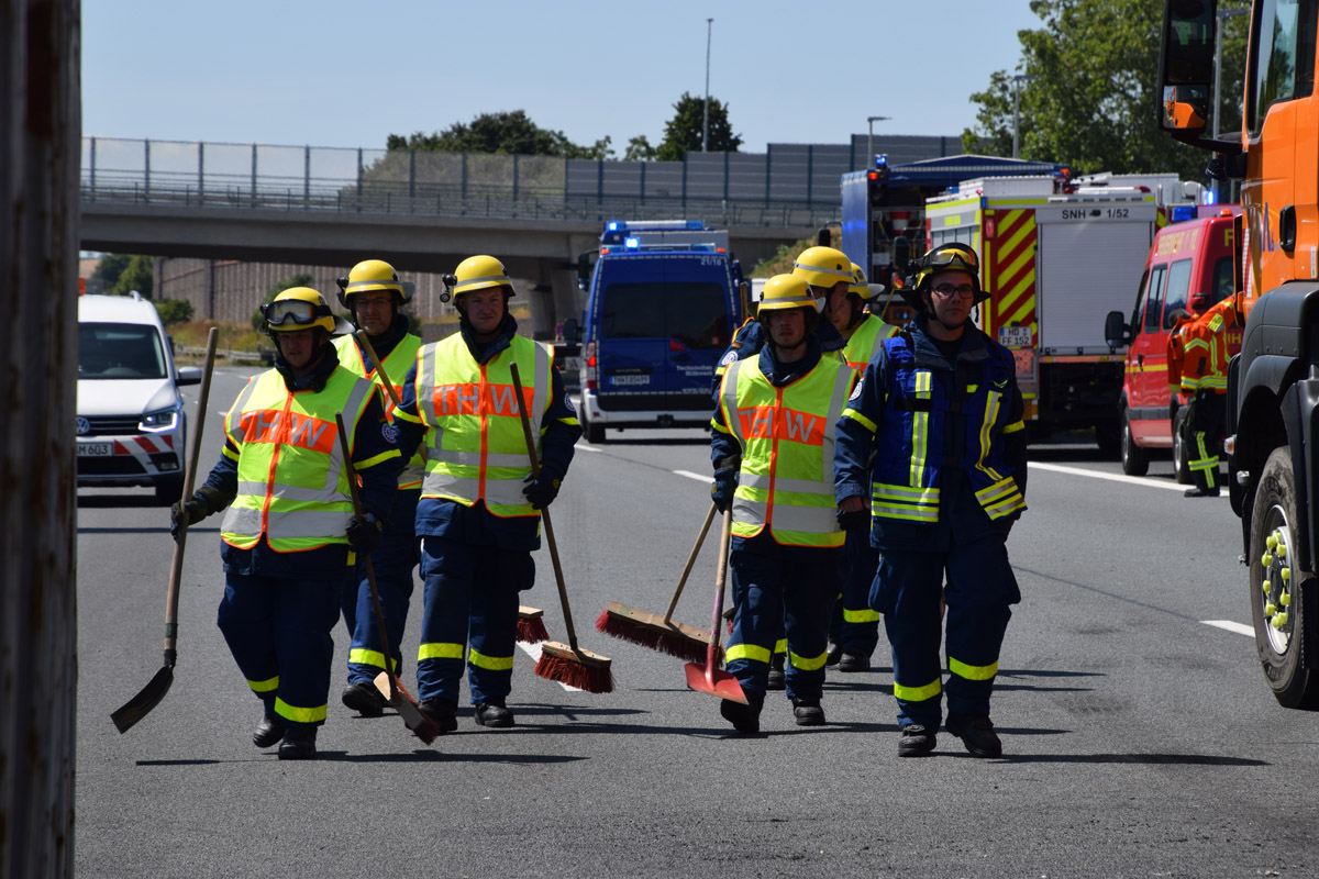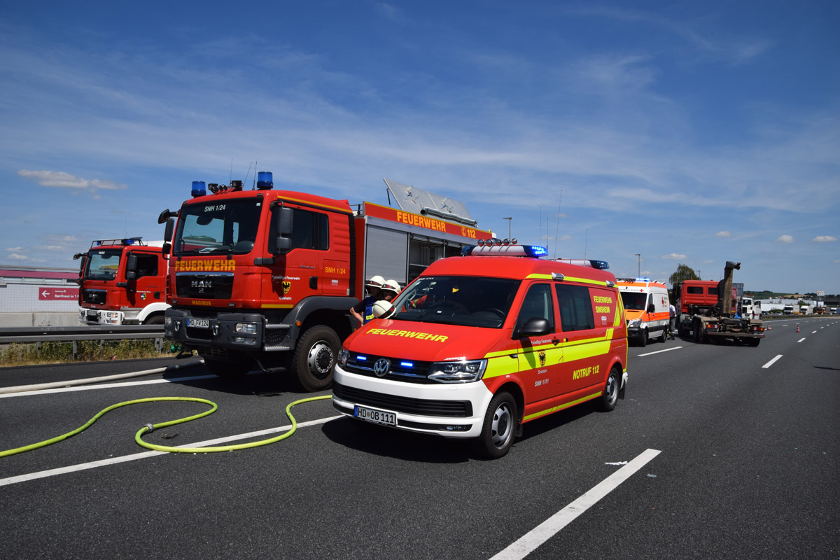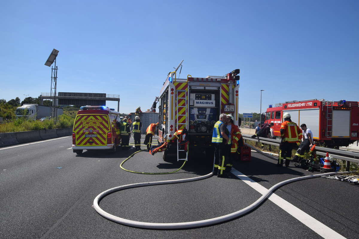 Sinsheim. (red) Nach dem Lkw-Brand auf der A6 heute Mittag dauern derzeit noch die Aufräumarbeiten an. Die Autobahn ist nach wie vor voll gesperrt. Hilfskräfte von Feuerwehr und THW arbeiten Hand in Hand um die Fahrbahn schnell freigeben zu können. In der folgenden Bildergalerie sieht man die Arbeit der Einsatzkräfte.