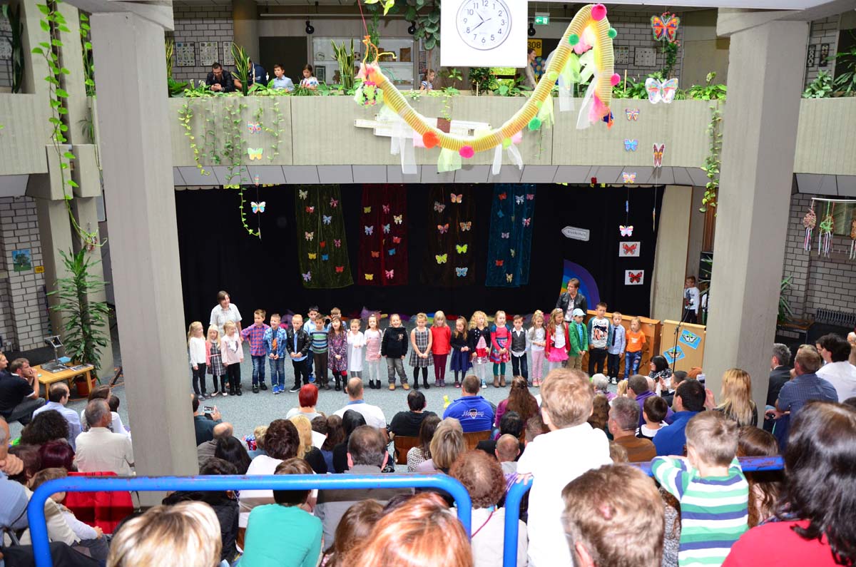 Die Kinder der 2a sangen und tanzten zum Thema Schmetterlinge und Schule. Ein Bücherregal und die Phantasie beim Lesen standen im Mittelpunkt. Zuvor begrüßten Schülerinnen und Schüler die zahlreichen Zuschauer mit einem Buchstabensalat aus dem ein „Herzlich Willkommen“ wurde.