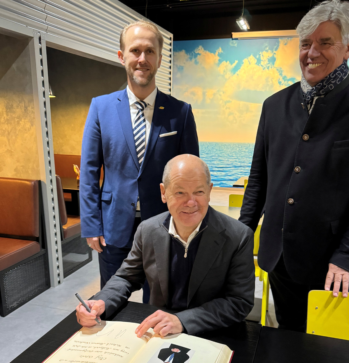 Bild (Stadt Sinsheim): Eintrag ins Goldene Buch der Stadt Sinsheim im Technik Museum Sinsheim: v.l.n.r.: Oberbürgermeister Marco Siesing, Olaf Scholz, Museumspräsident Hermann Layher.