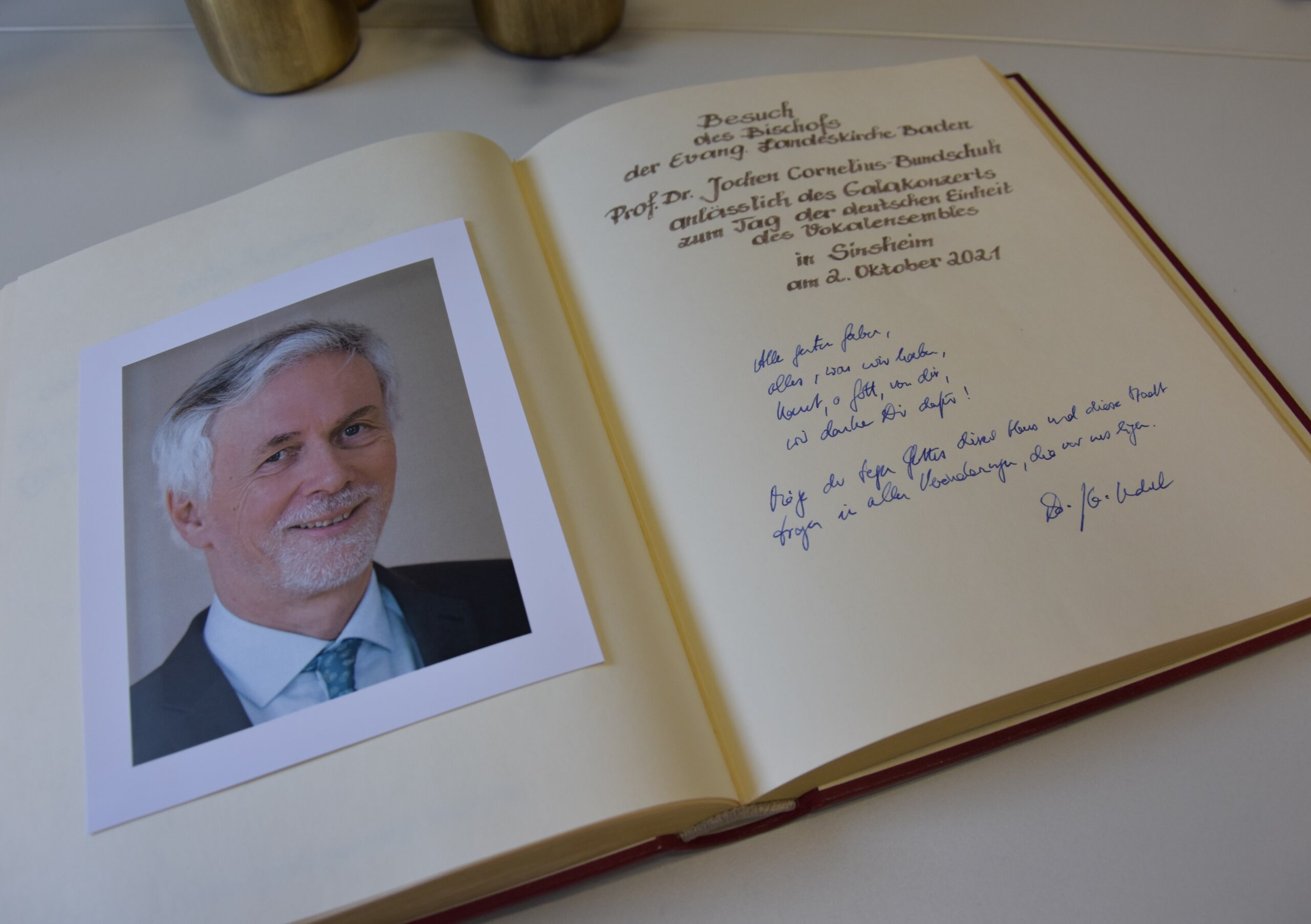Als Ehrengast und Interviewpartner begrüßte das Vokalensemble den Landesbischof der Evangelischen Landeskirche in Baden Prof. Dr. Jochen Cornelius-Bundschuh. Im Vorfeld kam der Landesbischof mit Oberbürgermeister Jörg Albrecht, Rolf Geinert, Dekanin Christiane Glöckner-Lang und Dekan Hans Scheffel im Sinsheimer Rathaus zusammen, segnete das Rathaus und trug sich in das Goldene Buch der Stadt ein.
