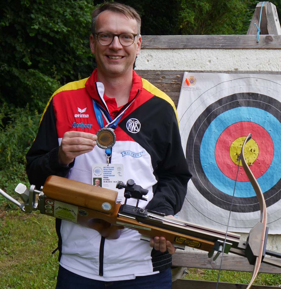 (zg) Bei der Europameisterschaft 2018, die vom 28. Juni bis 01. Juli 2018 in Pärnu (Estland) stattfand, startete Oliver Steiger, vom KKS Reihen, mit der Deutschen Nationalmannschaft in der Disziplin Feldarmbrust IAU. Die Feldarmbrust wiegt bis zu 10 kg und hat einen mechanischen Abzug. Geschossen wird stehend aus einer Entfernung von 65, 50 und 35 Metern auf eine farbige 10er Ringscheibe mit 60 cm Durchmesser. Er belegte dort mit Ralf und Steffen Hillenbrand in der Herren-Mannschaft einen sensationellen 2. Platz und wurde Vize-Europameister. In der Einzelwertung belegte Oliver Steiger mit 1650 Ringen den 10. Platz.