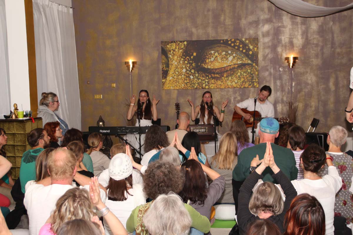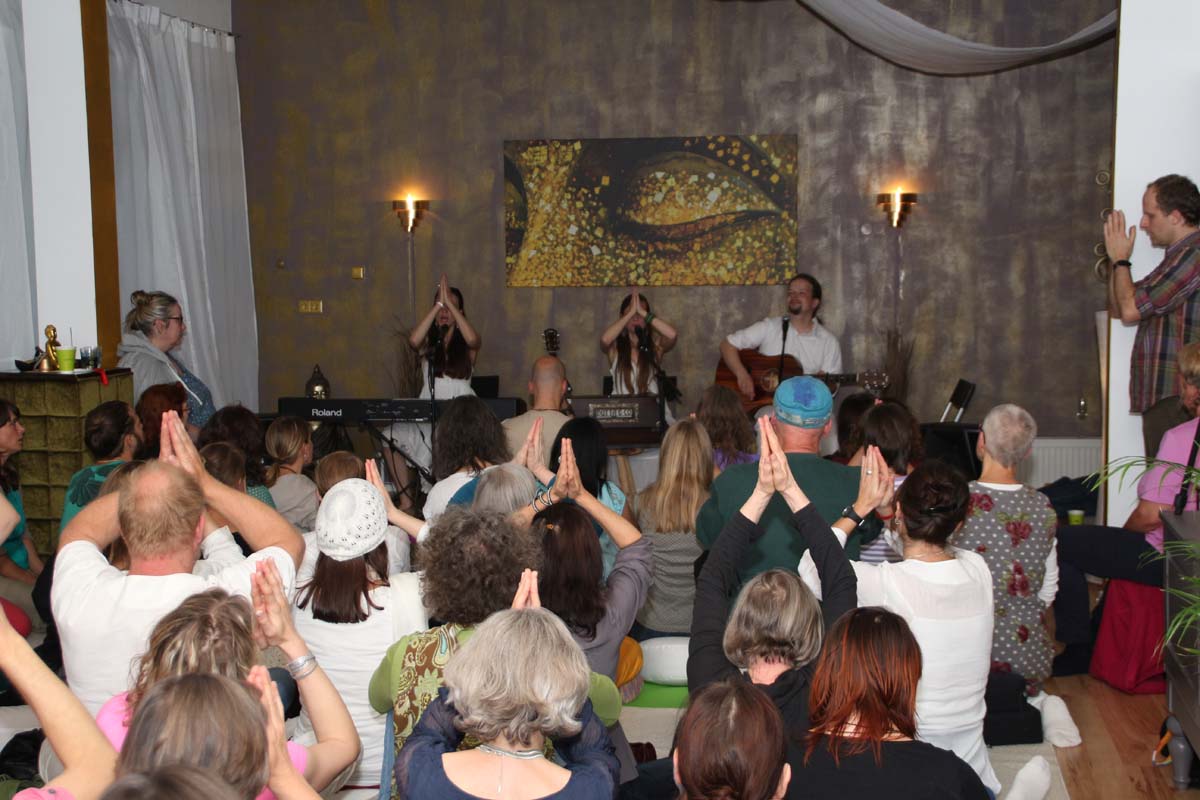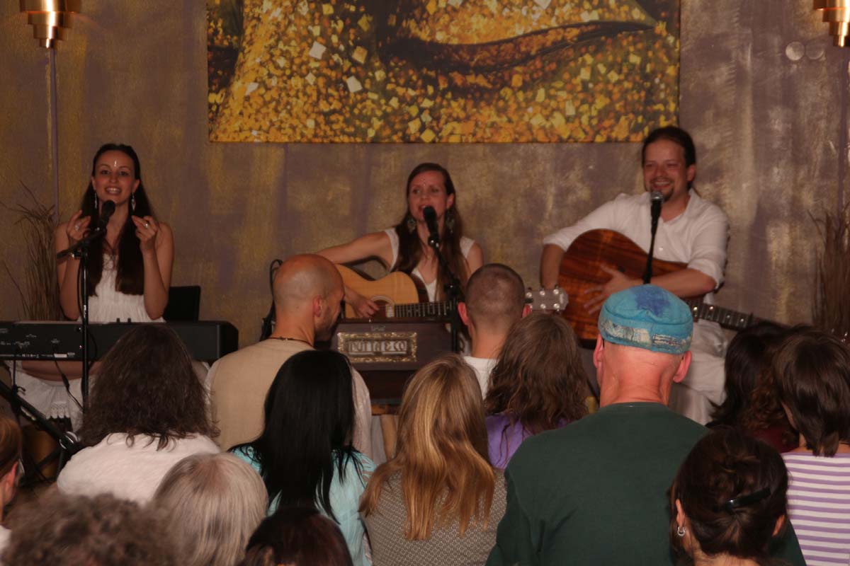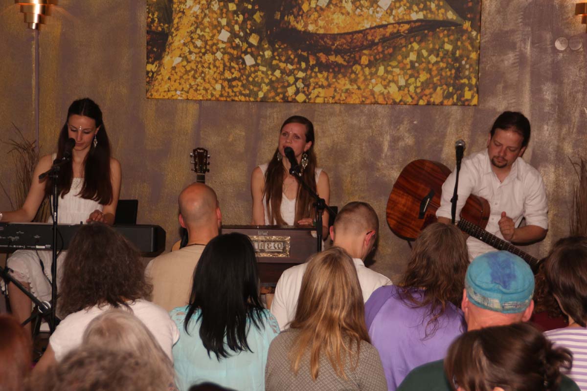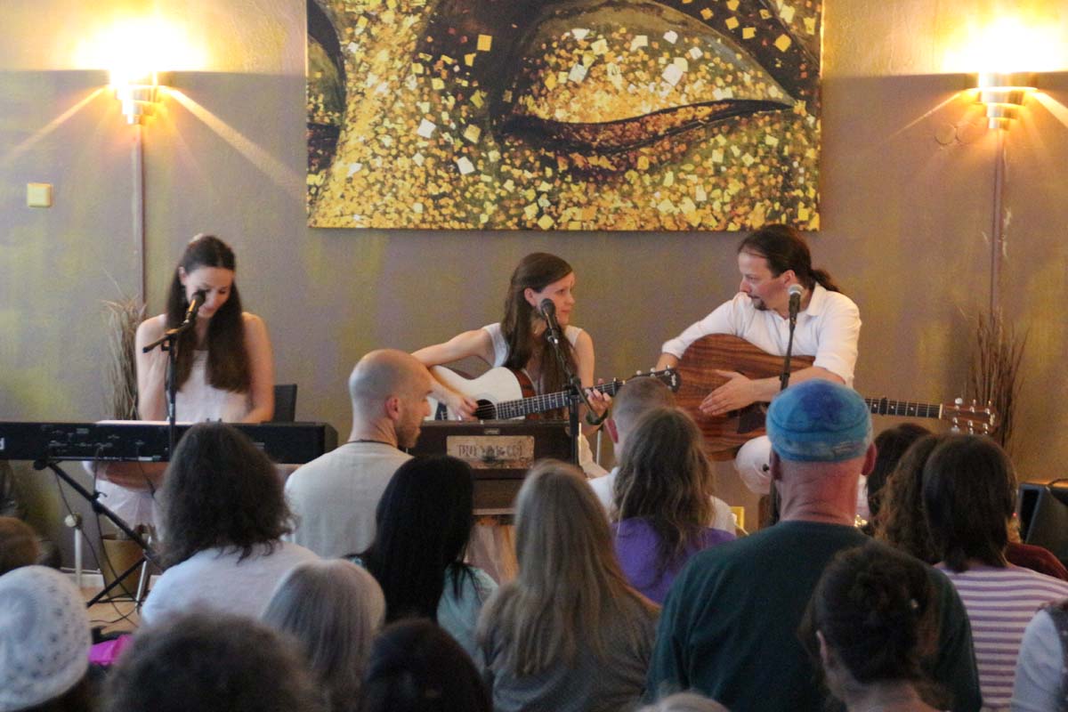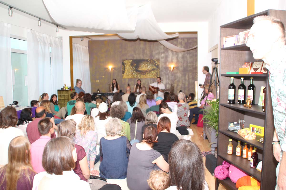 IMG_4885(cr) Das neue Kundalini Yoga Zentrums in Sinsheim in der Rosenpassage von Marina Latincic wartete am Samstag Abend mit einem ganz besonderen Leckerbissen auf. Zu Gast waren The Love Keys und Anandini mit einem Mantra Konzert. Und das war ein Konzert nicht nur für Yoga Enthusiasten. Warme angenehme Klänge mit Gitarren, E-Piano, Cajon und einem selten gehörten Instrument dem Harmonium, entführten das Publikum in eine ganz andere Welt. Dazu verzauberte die faszinierende Stimme von Anandini, die mich ein wenig an die Klasse von Katie Melua erinnerte. Entspannt und unaufdringlich wurde das Publikum von der charmanten Sängerinnen zum mitmachen animiert.