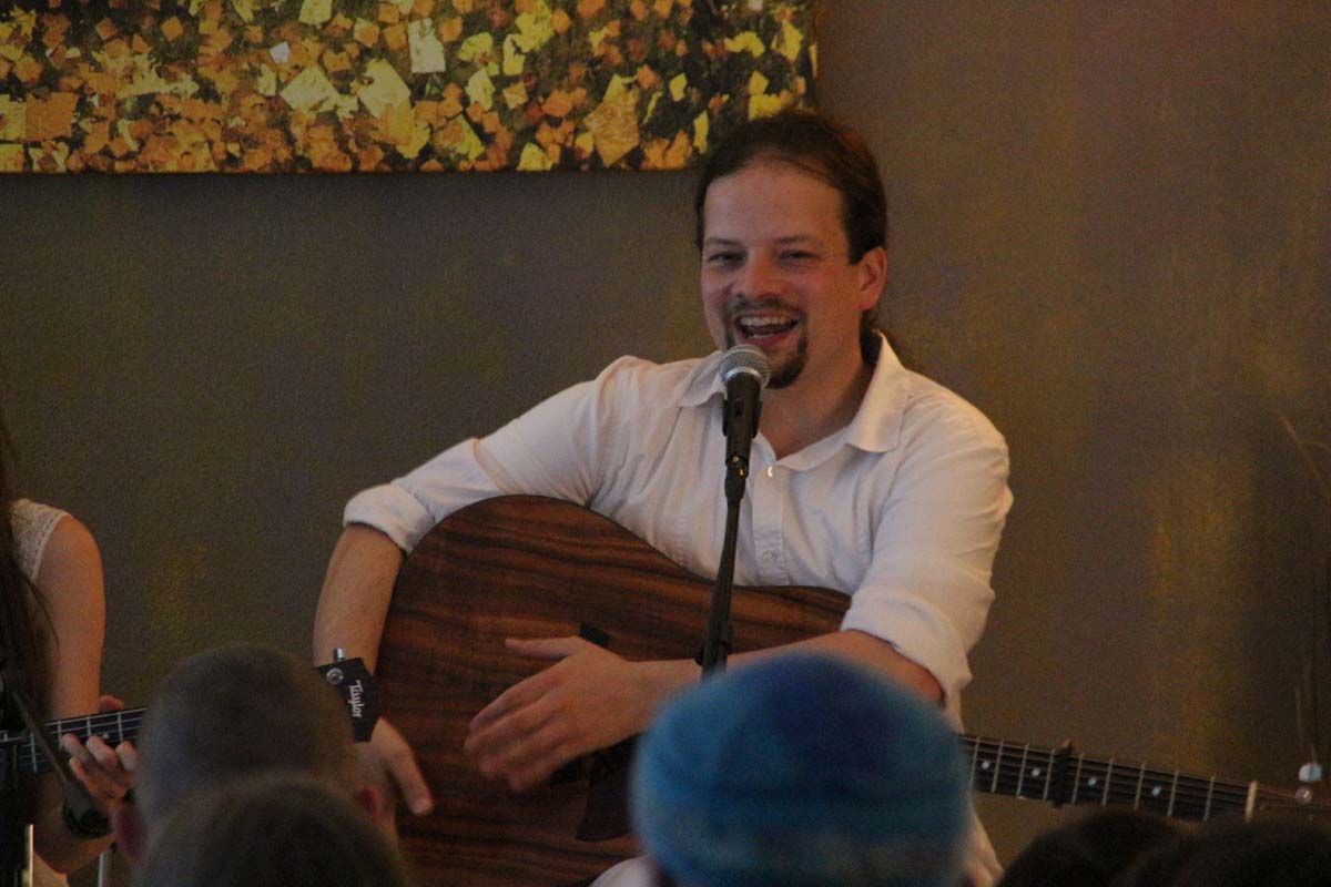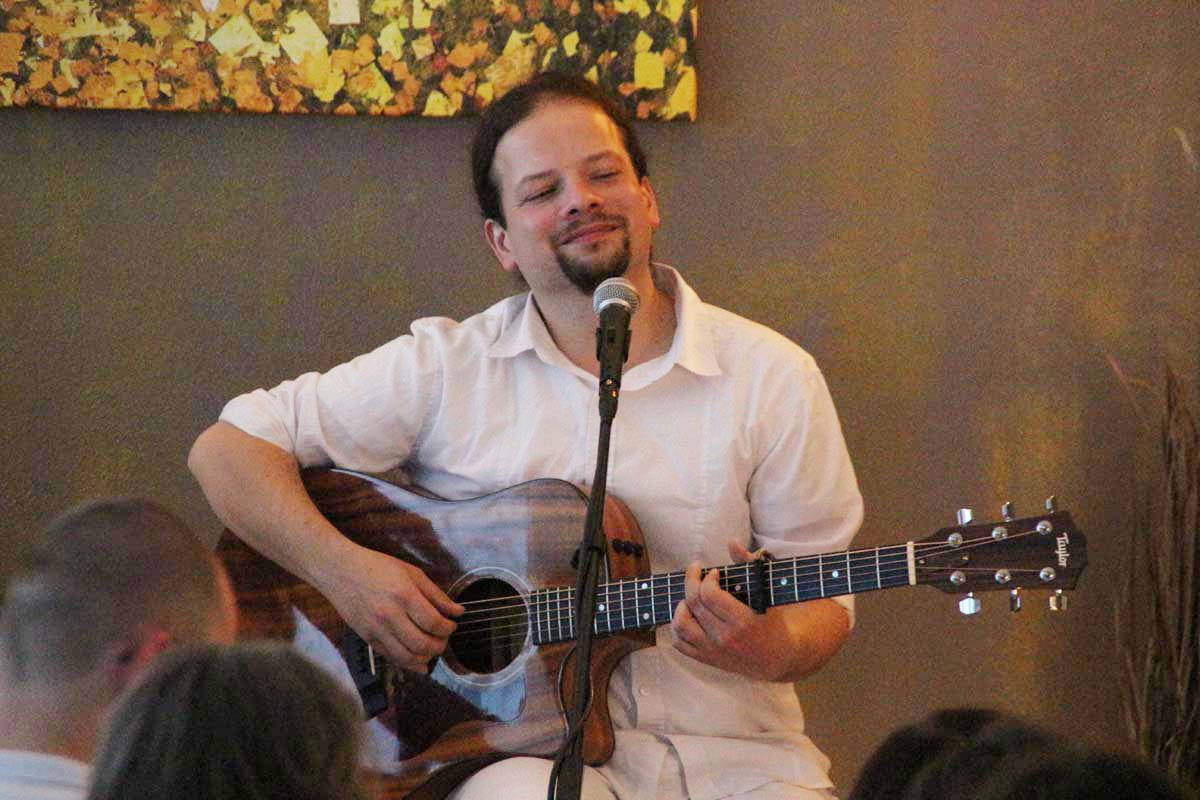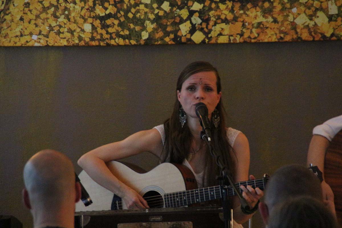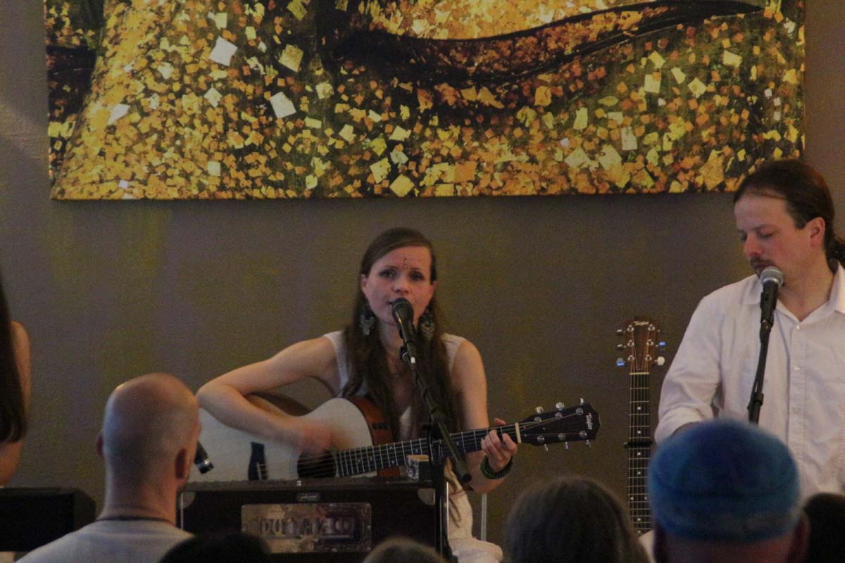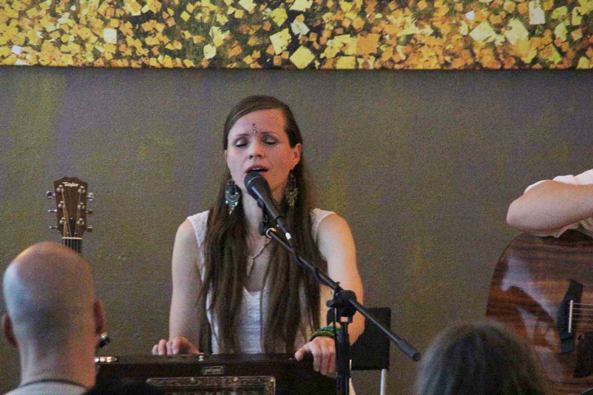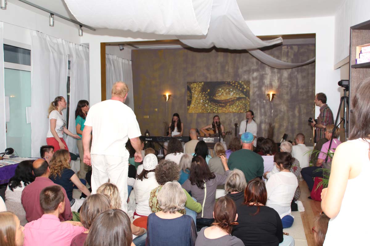 IMG_4885(cr) Das neue Kundalini Yoga Zentrums in Sinsheim in der Rosenpassage von Marina Latincic wartete am Samstag Abend mit einem ganz besonderen Leckerbissen auf. Zu Gast waren The Love Keys und Anandini mit einem Mantra Konzert. Und das war ein Konzert nicht nur für Yoga Enthusiasten. Warme angenehme Klänge mit Gitarren, E-Piano, Cajon und einem selten gehörten Instrument dem Harmonium, entführten das Publikum in eine ganz andere Welt. Dazu verzauberte die faszinierende Stimme von Anandini, die mich ein wenig an die Klasse von Katie Melua erinnerte. Entspannt und unaufdringlich wurde das Publikum von der charmanten Sängerinnen zum mitmachen animiert.