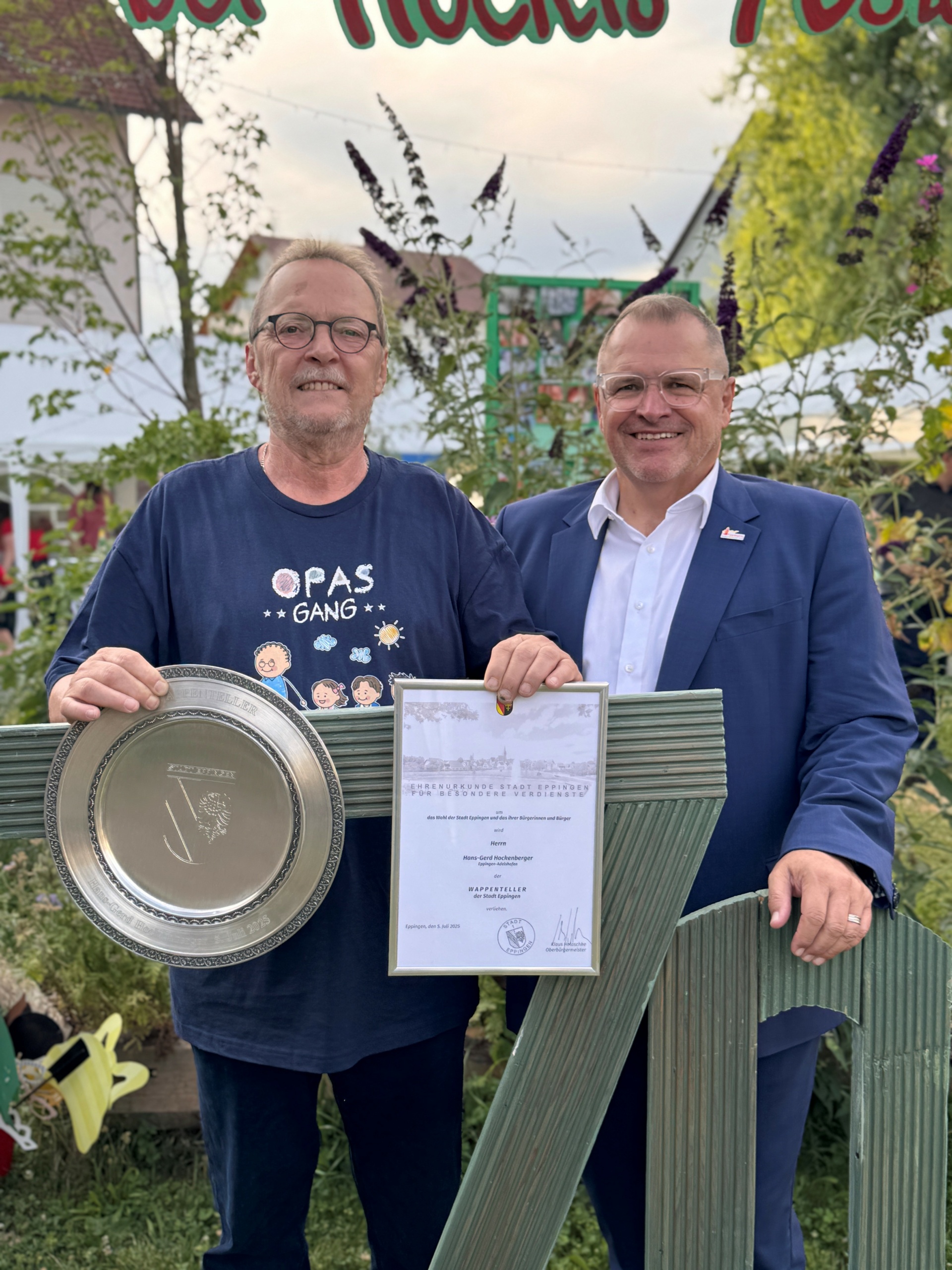 Am Samstag, 5. Juli, überreichte Oberbürgermeister Klaus Holaschke den Wappenteller der Stadt Eppingen an Hans-Gerd Hockenberger. Anlass war dessen 70. Geburtstag, den er im Kreise von Familie und Freunden im eigenen Garten feierte.