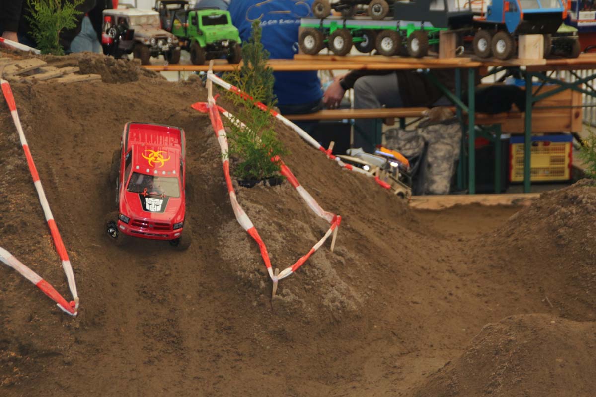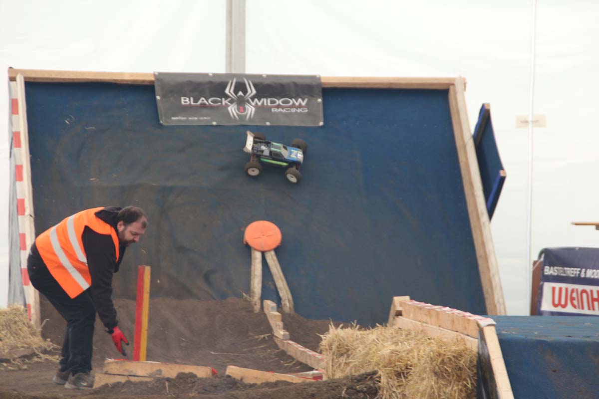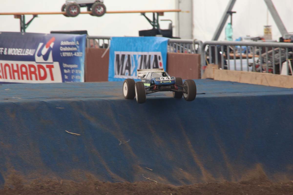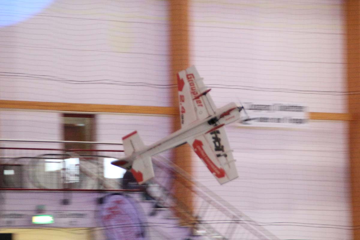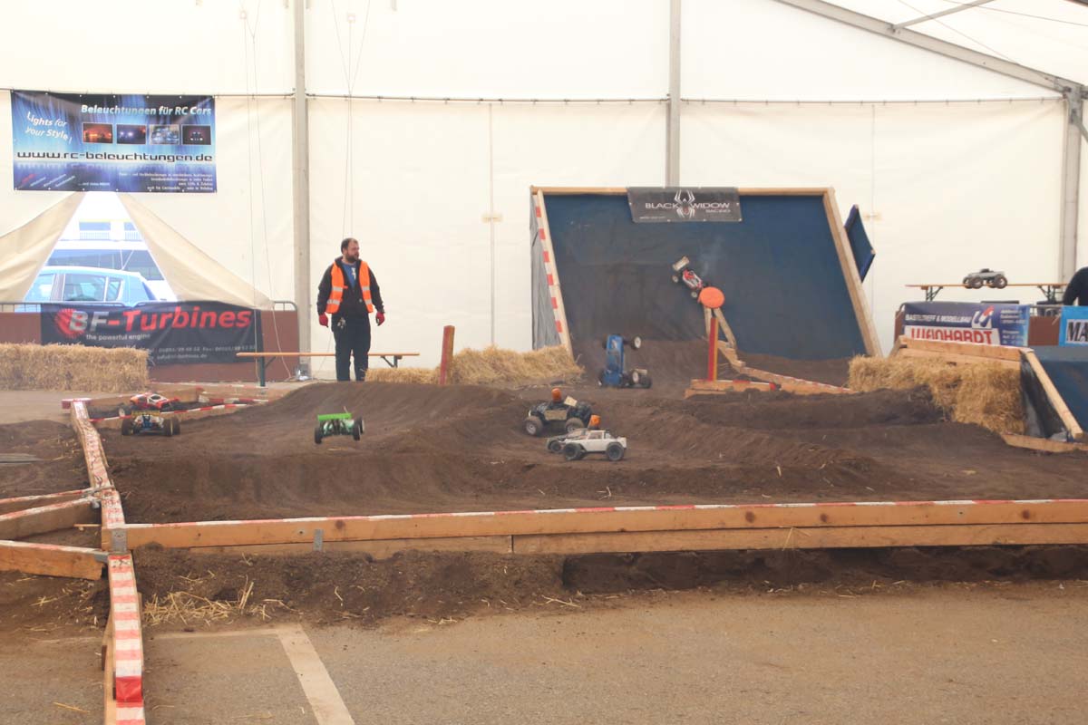Auch im Innenbereich der Messe gab es wieder jede Menge Action zu erleben. Vom traditionsreichen Indoor-Flugfeld mit Produktneuheiten und innovativen Eigenbauten, allesamt eindrucksvoll mit Lichtshow und Musik in Szene gesetzt, über speziell eingerichtete Event–Bereiche mit spektakulären Stunts bei der RC-Car-Offroad-Action bis hin zu Revoball, einer Art Fußball mit Off-Road-Boliden, wo nur so die Fetzen flogen.