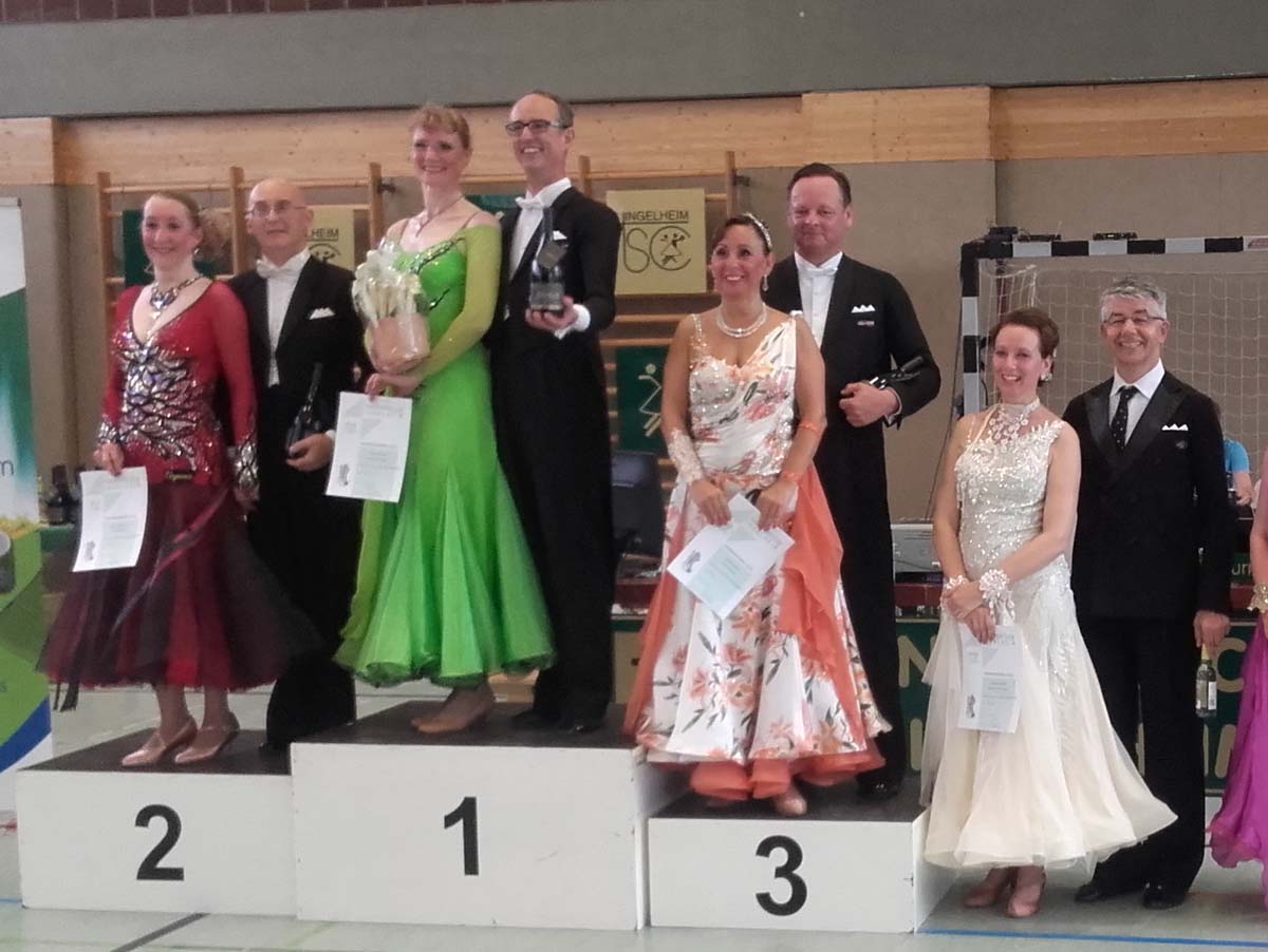 (zg) Seit 2002 tanzen Jutta und Toni Völkl beim Tanzsportclub Rot-Gold Sinsheim. Von 2003 bis 2007 nahmen sie an Breitensportwettbewerben teil. Danach mussten sie verletzungsbedingt pausieren, tanzten aber weiterhin im Gesellschaftstanzkreis von Rot-Gold Trainer, Dr. Michael Schäfer.  Im Mai 2017 sind sie in den Turnierkreis von Patrick Zimmermann gewechselt. Im hessischen Hanau konnten sie in der Senioren III D Standardklasse ( Anfänger-Turnierklasse ab Alter 50 / 55 Jahren ) den 1. Platz mit nach Hause nehmen. Als Sieger durften sie in der nächsthöheren Startklasse Senioren III C mitmachen und erreichten auch hier von 19 startenden Paaren das Finale. Auch in Ingelheim ( Rheinland-Pfalz ) belegten sie in Sen III D den 1. Platz von 6 startenden Paaren und in der Sen III C den 2. Platz von 8 Paaren.
