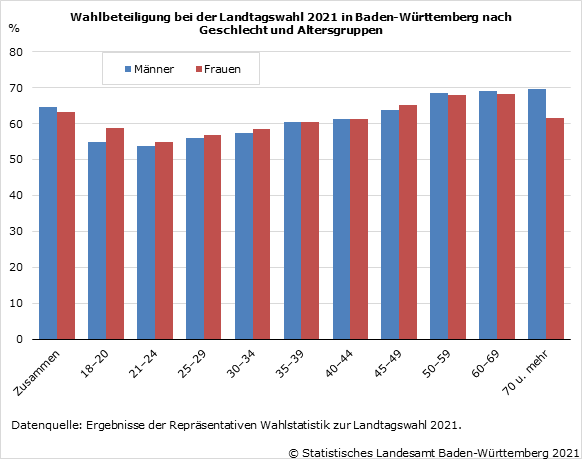 Insgesamt war die Anzahl der weiblichen Wahlberechtigten leicht höher als die der männlichen (1 055,3 weibliche auf 1 000 männliche). Da jedoch die Anzahl an weiblichen Wahlberechtigten im Vergleich zu 1 000 männlichen über die Altersgruppen hinweg stark schwankt (zwischen 933,0 bei den 25- bis 29-Jährigen und 1 309,9 bei den über 70-Jährigen) ist vor allem der Unterschied zwischen den Wahlberechtigten und den tatsächlichen Wähler(innen) interessant. Am größten war dieser Unterschied in der Gruppe der über 70-Jährigen bei der zwar 1 309,9 weibliche Wahlberechtigte auf 1 000 männliche kamen, jedoch nur 1 158,8 Wählerinnen auf 1 000 Wähler. Ebenfalls auffällig ist der Unterschied in der Gruppe der 18- bis 20-Jährigen. Auf 1 000 Wähler gaben 1 065,9 Wählerinnen ihre Stimme ab, obwohl in dieser Altersgruppe nur 997,3 weibliche Wahlberechtigte auf 1 000 männliche kamen. In der Gruppe der 35- bis 39-Jährigen hingegen ist der Unterschied sehr gering. Die Anzahl an weiblichen Wahlberechtigten pro 1 000 männlichen betrug 980,6, die Anzahl an Wählerinnen je 1 000 Wähler 980,2.