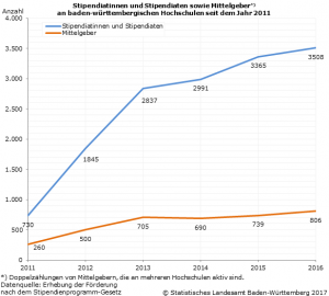 Im Jahr 2016 erhielten in Baden‑Württemberg 3 508 Studierende Leistungen nach dem Deutschlandstipendium. Nach Angaben des Statistischen Landesamtes Baden‑Württemberg waren das 4 Prozent mehr Stipendiatinnen und Stipendiaten als ein Jahr zuvor (2015: 3 365 Studierende). Mit 2 101 wurden die meisten Stipendien (60 Prozent) an Universitätsstudierende vergeben. Weiterhin erhielten 1 285 Studierende (37 Prozent) an Hochschulen für angewandte Wissenschaften ein Deutschlandstipendium. An den Kunsthochschulen gab es 65 (2 Prozent) und an den Pädagogischen Hochschulen 57 (2 Prozent) Stipendiatinnen und Stipendiaten.
