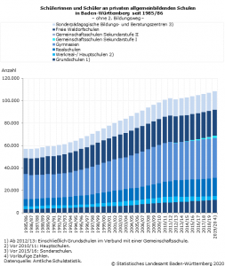 Nach den vorläufigen Ergebnissen der amtlichen Schulstatistik des Statistischen Landesamts besuchen im aktuellen Schuljahr 2019/20 in Baden-Württemberg gut 108 200 Schülerinnen und Schüler eine private allgemeinbildende Schule. Dies sind knapp 1 400 mehr als im vorangegangenen Schuljahr (1,3 %). Der Trend einer positiven Schülerzahlentwicklung – mit Ausnahme des Schuljahres 2012/13 nach Abgang des doppelten Abiturjahrganges – wird damit weiter fortgesetzt und erreicht abermals einen neuen Höchststand. Von allen Schülerinnen und Schülern an allgemeinbildenden Schulen besucht damit nahezu jede bzw. jeder Zehnte eine Schule in privater Trägerschaft. Diese und weitere Informationen zum Zukunftsthema Bildung werden auf der Bildungsmesse didacta vom 24. – 28. März 2020 in Stuttgart sowie online auf www.statistik-bw.de präsentiert.