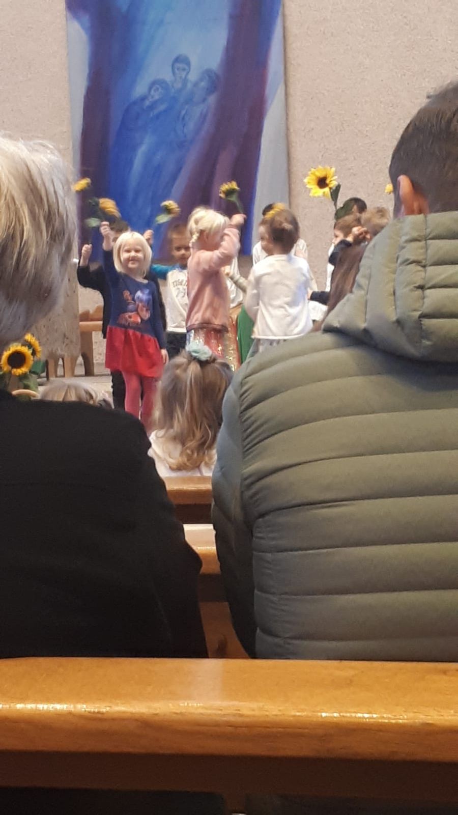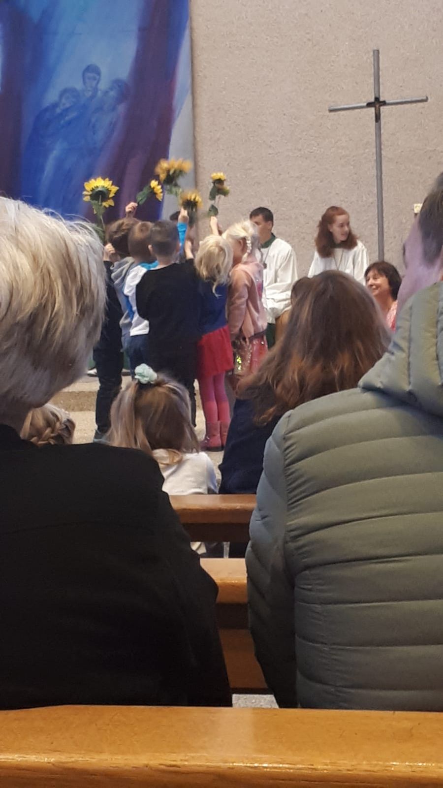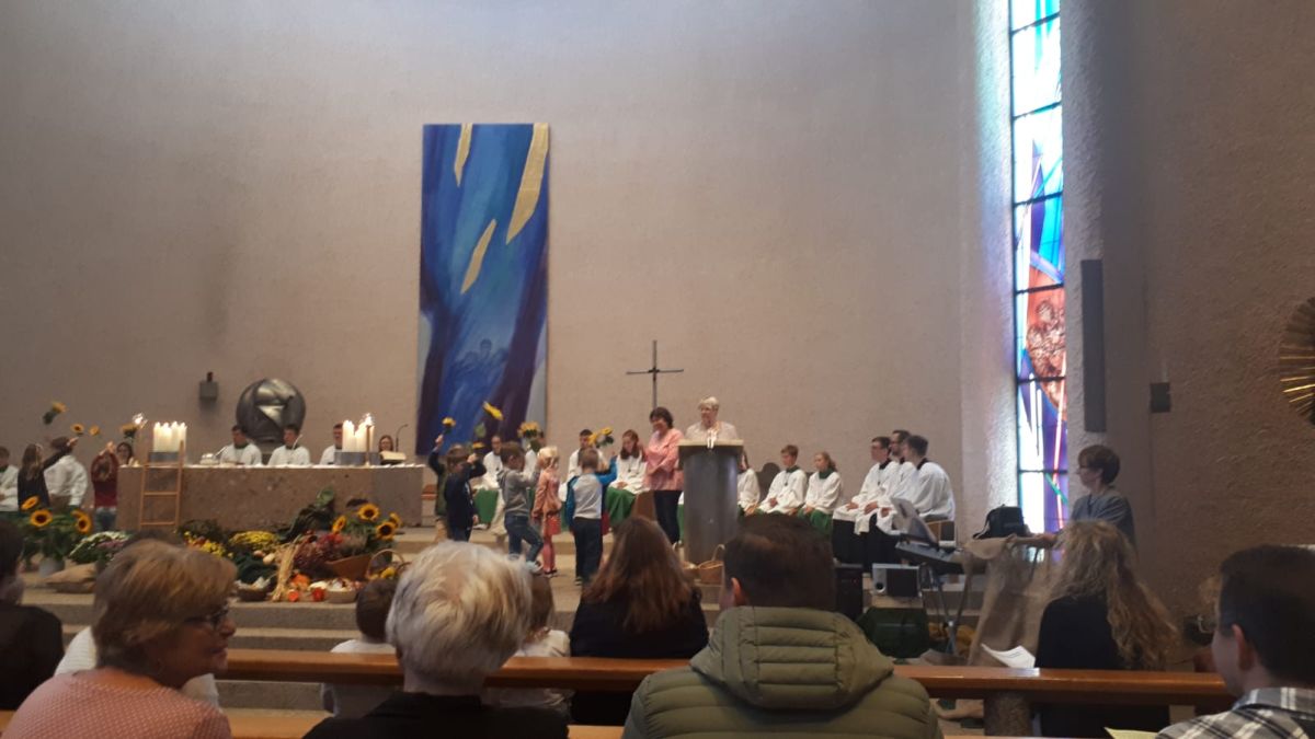 (zg) Am 29. September 2019 fand unser diesjähriger Erntedankgottesdienst, unter der Leitung von Herrn Pfarrer Oser, in der St. Jakobus Kirche in Sinsheim statt. „In unserm kleinen Garten…“ lautete das Thema dieser Feier. Begleitet von vielen Ministranten zogen Kinder, Erzieher und Pfarrer Oser in die mit Erntegaben geschmückte Kirche ein. Einleitend sangen die Kinder vor dem Altar“ Wir feiern heut ein Fest“ vor der versammelten Gemeinde. Weitere Lieder wie das, „Hallelu …“, „Danke für diese gute Ernte …“ haben zum Dank beigetragen. Das Erlebte der vergangenen Monate der Gemeinde durch Texte und dazu passende Tänze näher gebracht. Ein Regentanz mit großen Tüchern, ein Sonnenblumentanz, sowie ein Gospeltanz „Fill my Cup …“ brachten Bewegung, Farbe und den Dank für all die Gaben hervor. Die mitgebrachten und liebevoll geschmückten Erntekörbchen wurden zum Altar gebracht und dort von Pfarrer Oser gesegnet. Zwei zusätzlich reich gefüllte Körbe, voll mit Sonnenblumenkörnen wurden durch die Reihen gereicht und jeder Gottesdienstbesucher durfte sich ein Päckchen zum Verzehr, zur Erinnerung an diese Feier, mitnehmen. Das Gebet, „Alle guten Gaben, alles was wir haben, kommt o Gott von dir wir danken dir dafür.“ war zusätzlich auf der Verpackung zu lesen. Verbindung wurde aufgebaut zu den vergangenen Monaten mit all den Arbeiten am Hochbeet im KINDERGARTEN. Vom Gießen, Säen und Pflanzen war die Rede. Weiteres Liedgut wie: „Ein Volltreffer Gottes bist du …“ und „Gottes Liebe, Gottes Gaben, Gottes Segen …“, Fürbitten und Dankgebete bereicherten den Gottesdienst. Während der Kommunion brachten Kinder zu meditativen Dankesworten und leiser Musik verschiedene Gegenstände zum Thema DANKBARKEIT vor den Altar.