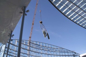 (cr) Dienstagmorgen in der Bäderwelt Sinsheim: Erstmals öffnete sich das gigantische Panoramadach über der Badewelt. Die 384 Tonnen schwere und 54 Meter lange Glaskonstruktion in der Badewelt gibt den Weg für die ungewöhnliche Einpflanzaktion der Palmen frei.