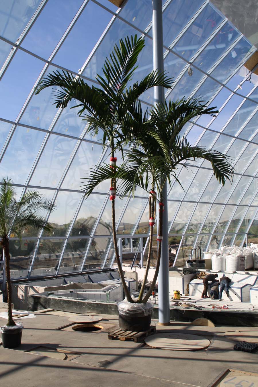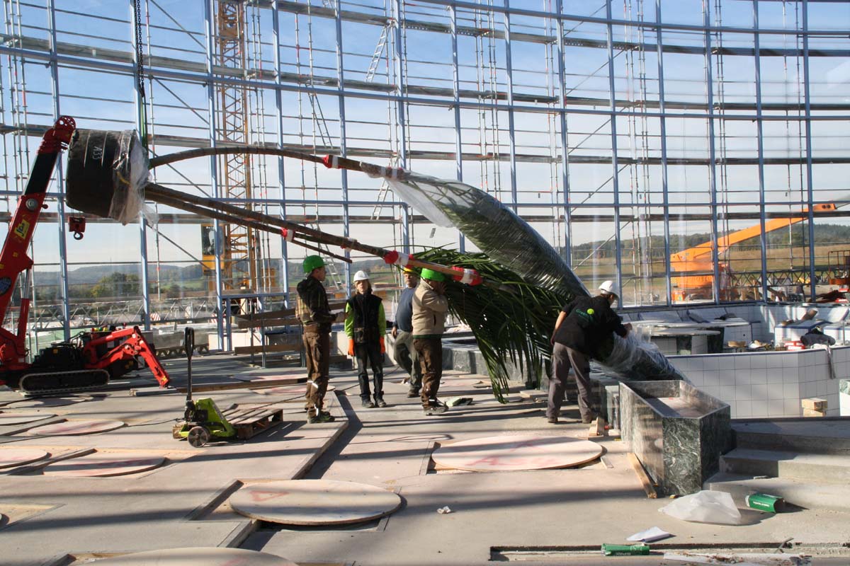 Die Palmen werden auf eine Spezialkonstruktion von Sprudelkisten gestellt und in Granulat eingebettet. Die grossen Palmen können schon mal weit über eine Tonne wiegen. Die ganze Aktion bis zur Fertigstellung des Südseeflairs wird einige Tage in Anspruch nehmen. Um das tropische Flair noch zu verstärken, werden rund um das Becken ca. 1.000 Orchideen eingesetzt. Man sieht: Es gibt noch viel zu tun bis zur Eröffnung am 18. Dezember 2012.