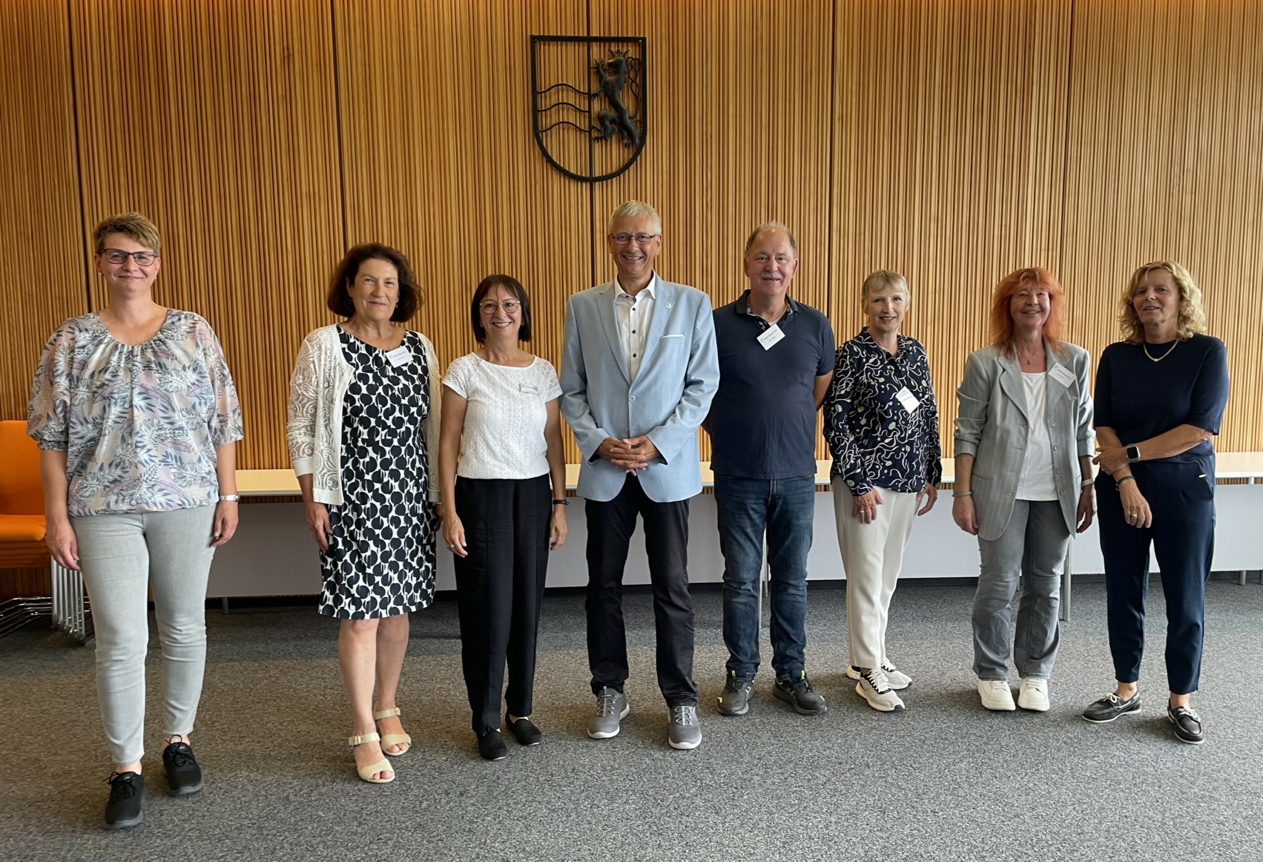 Hanspeter Böckli (5.v.l.), zuletzt beschäftigt beim Straßenverkehrsamt, Amanda Müller (2.v.l.), zuletzt beschäftigt beim Sozialamt, Heike Salch (7.v.l.), zuletzt beschäftigt beim Ordnungsamt, Ekrem Cengiz (nicht auf dem Foto), zuletzt beschäftigt beim Amt für Flurneuordnung, Christiane Sotillo-Mejias (6.v.l.), zuletzt beschäftigt beim Jugendamt und Elke Zimmermann (3.v.l.), zuletzt beschäftigt beim Sozialamt.