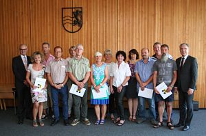 (zg) „Es gibt etwas zu feiern“, begrüßte Landrat Stefan Dallinger am vergangenen Dienstag, 26. Juli 2016 im Sitzungssaal 5. OG im Landratsamt in Heidelberg elf Dienstjubilare im Beisein von Personalratsvorsitzenden Martin Streib sowie der Dezernats- und Amtsleitungen. Neun davon feierten ihre 25-jährige und zwei ihre 40-jährige Zugehörigkeit zum öffentlichen Dienst. Stefan Dallinger dankte für die „langjährige verlässliche Arbeit im jeweiligen Aufgabengebiet“. Alle Dienstjubilare haben „ihren ganz eigenen Beitrag für die Bürgerinnen und Bürger des Rhein-Neckar-Kreises geleistet“, lobte Dallinger. Jede und jeder an seinem Platz sei für das gute Funktionieren der Verwaltung notwendig und das wissen und die Kenntnisse aller Elf ein „großer Pluspunkt“ für die tägliche Arbeit, so der Landrat. Hüseyin Topaloglu vom Personalrat schloss sich den Wünschen des Landrats an und machte auf die Jubiläumsgabe und den Tag Sonderurlaub, den sich alle Jubilare verdient hätten, aufmerksam.