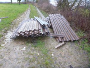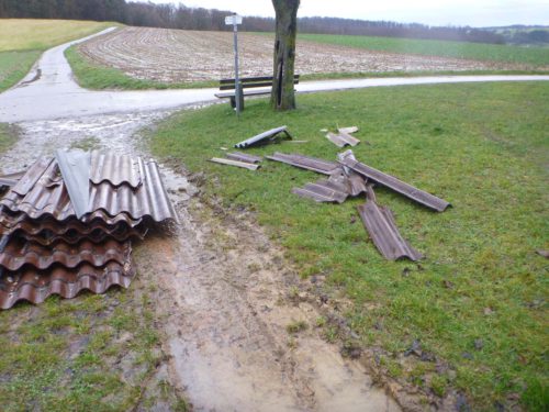 Am Donnerstag, 18.01.2018 wurde dem Ordnungsamt der Stadt Neckarbischofsheim gemeldet, dass im Gewann „Vorderer Eckberg“ in Helmhof eine größere Menge Eternitdachplatten auf und neben den Feldweg abgeladen wurden. Der bislang unbekannte Verursacher hat in der Nähe vom Tabakschopfen ca. 2 m³ alte und aber auch neuere Platten verbotenerweise abgeladen.
