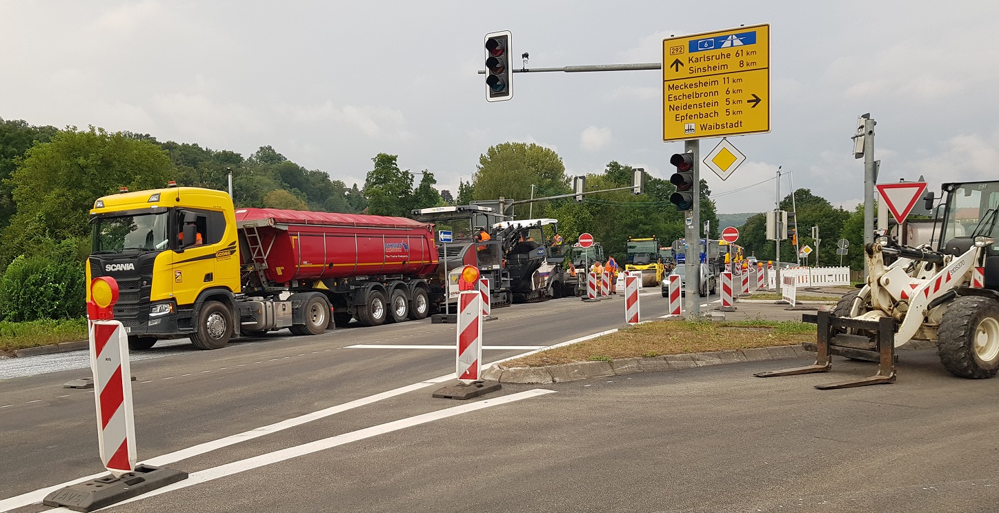 Trotz der gestrigen Gewitter verlaufen die Arbeiten weiterhin nach Plan. Zurzeit wird der letzte Bauabschnitt asphaltiert. Am kommenden Wochenende 7./8. September 2024 finden die noch notwendigen Restarbeiten, wie beispielsweise das Aufbringen der Fahrbahnmarkierung, statt. Bis zum 8. September werden diese Arbeiten beendet werden, so dass voraussichtlich gegen Abend des 8. September 2024 der Verkehr wieder wie gewohnt auf der B 292 zwischen Mosbach und Sinsheim fließen kann.