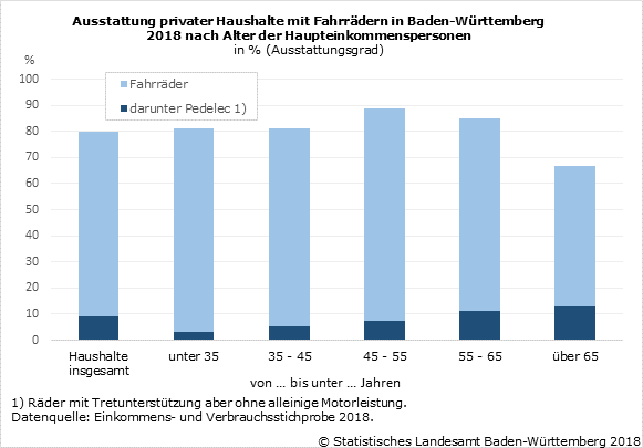 Zu Beginn des Jahres 2018 verfügten 80 % oder rund 4,1 Mill. aller Haushalte in Baden-Württemberg über ein oder mehrere Fahrräder. Jeder elfte Haushalt, das sind rund 457 000 Haushalte, besaß mindestens ein Pedelec. Die Ausstattung privater Haushalte mit Pedelecs steigt dabei mit dem Alter der Haupteinkommensperson. In der Altersgruppe der unter 35-Jährigen besitzen nur 3 % der Haushalte ein Pedelec, während bei den über 65-Jährigen der Anteil bei 13 % liegt. Der Ausstattungsbestand liegt landesweit bei 12 Pedelecs pro 100 Haushalte. Paare ohne Kinder sind mit 23 Pedelecs je 100 Haushalten überdurchschnittlich ausgestattet.