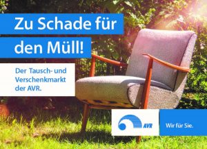 (zg) Seit 2009 ist der kostenlose Tausch- und Verschenkmarkt der AVR Kommunal GmbH online aktiv – und das mit großem Erfolg. In den letzten neun Jahren konnten über 760.000 Besucher und fast 8 Millionen aufgerufene Seiten verzeichnet werden. Tausende gebrauchte Gegenstände wurden seither getauscht oder verschenkt und somit einer weiteren Verwendung zugeführt, um aktiv Abfall zu vermeiden.