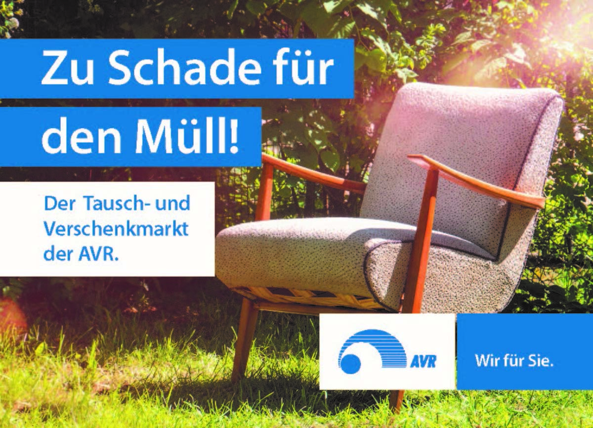 Für Dinge, die zu schade für den Müll sind, hat die AVR Kommunal ihren Tausch- und Verschenkmarkt im Internet und auf der AVR Abfall App eingerichtet. Und dieser boomt. Hier können gut erhaltene Möbel, Porzellan, Spielwaren oder funktionstüchtige Elektrogeräte zum Verschenken angeboten werden. Oder umgekehrt, kann man sich auf die Suche nach Dingen begeben, die man brauchen kann.