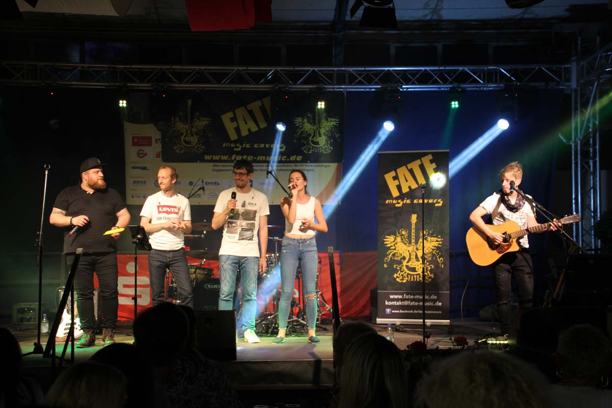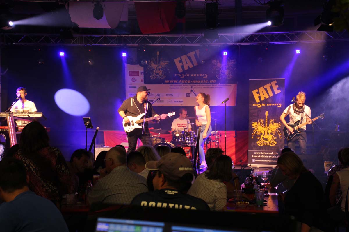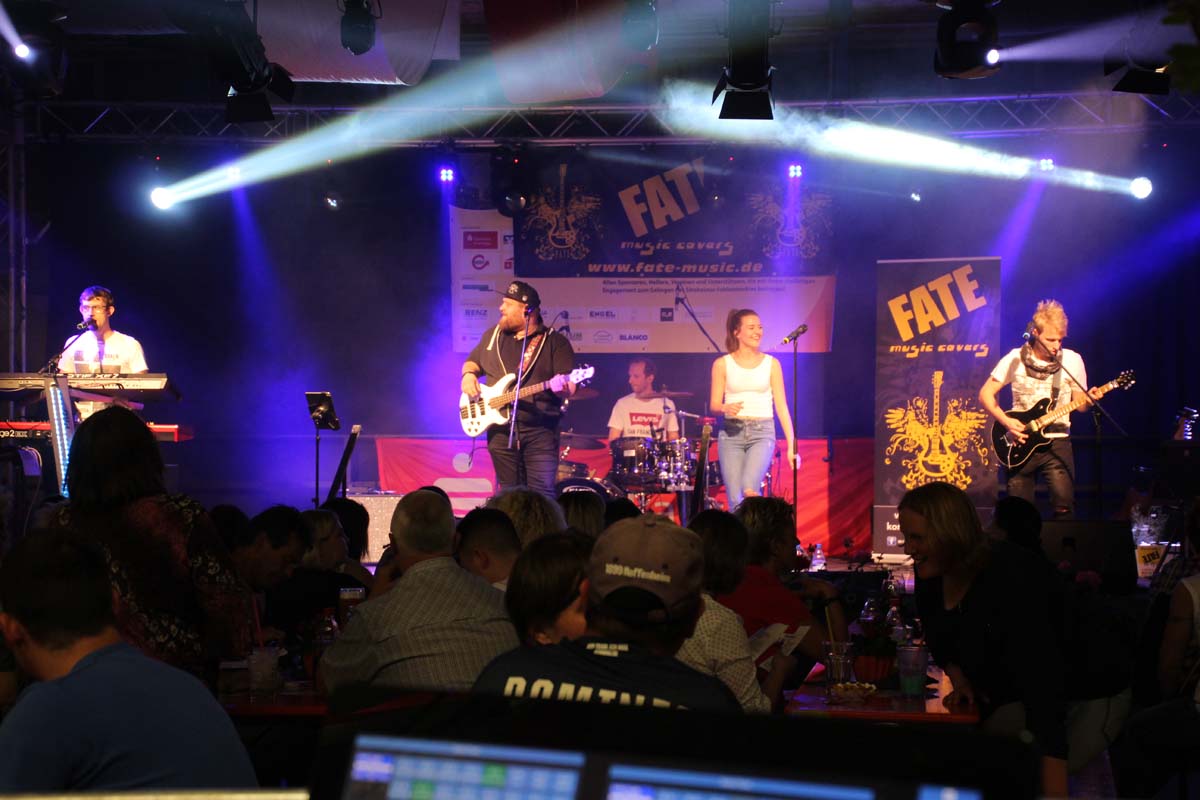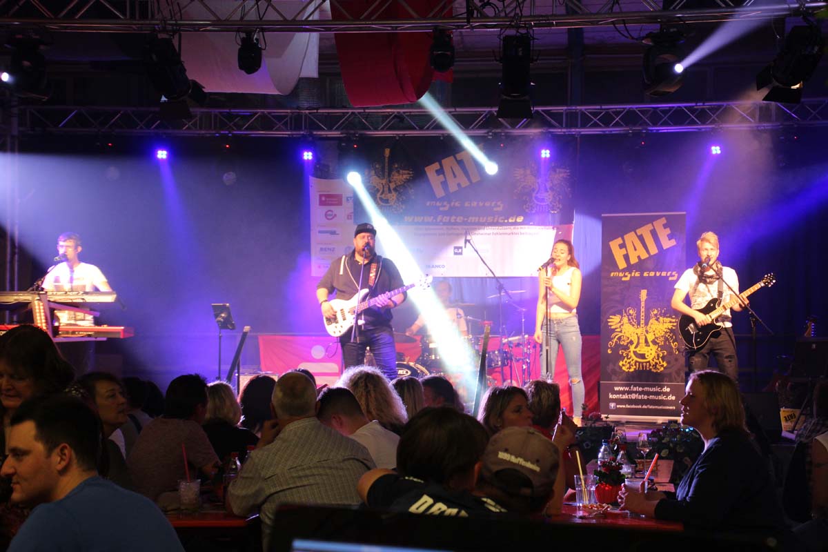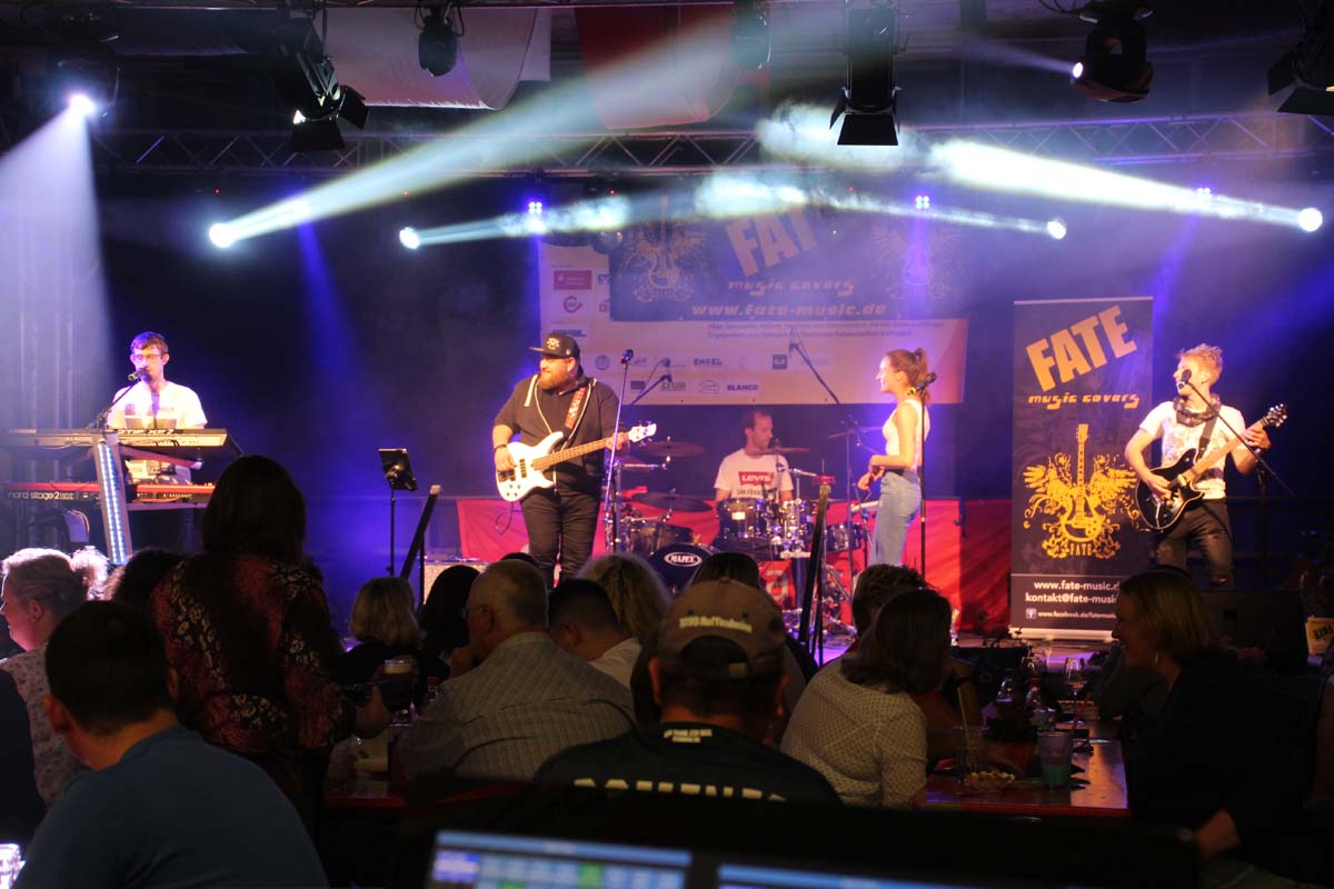(cr) Eine klasse Samstag Abend Party und eine volle Hütte bescherte uns dieses Jahr FATE auf dem Fohlenmarkt. Band Leader Chris Epp mit einer anderen Besetzung hatte ja schon am Vorabend bei der Wiesentalparty gezeigt wie man den Saal zum kochen bringt. FATE steht mittlerweile fast 15 Jahre auf der Bühne und überzeugt auch mit neuer Sängerin. Wer solche Bands vor Ort hat, der muss für gute Partyaction nicht unbedingt Bands von weiter her engagieren. An solch einem tollen Abend hat sich natürlich auch die komplette Hallengastronomie gefreut.