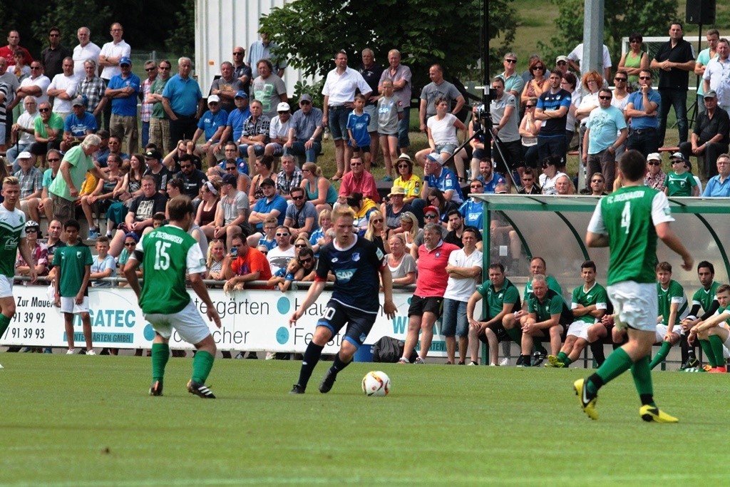 (hjj) Auch der FC Zuzenhausen war kein Prüfstein für die TSG 1899, obwohl man „erst“ in der 10. Minute das 0:1 markieren konnte. Der Verbandsligist ließ aber schon so ab und zu seine Klasse aufblitzen. Natürlich wäre es widersinnig, wenn man sich ernsthaft Gedanken gemacht hat, dass der FC eine Chance haben könnte. Wieder war erste Priorität, keine Verletzungen, Spielpraxis in der Vorbereitung für die die Ligaspiele, die Mitte August für die TSG 1899 beginnen, abgesehen vom Pokalspiel am 2. Augustwochenende und last but not least … Spaß an der Bewegung und am Spiel. Ich glaube das hatten beide, wobei das Ergebnis zweitrangig ist. Es war eine schöne Kulisse von gut 2000 Zuschauern, ich glaube der „Häuselgrund“ war schon lange nicht mehr so besucht. Die Attraktivität des Gegners war natürlich auch nicht ohne, obwohl eigentlich „Nachbar“ und nur wenige hundert Meter voneinander entfernt. Es begann, wie auch am Samstag in Wiesloch, sehr verhalten bis das erste Tor gefallen war, dann lief auch hier wieder das gleiche Programm ab. Was soll ich also viel Worte verlieren, hier ist eine kleine Auswahl, aus den 380 geschossenen Bildern …