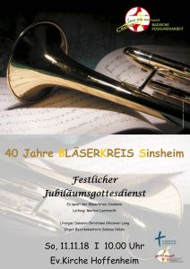 (zg) Der Bläserkreis Sinsheim lädt zu einem festlichen Jubiläumsgottesdienst anlässlich seines 40 – jährigen Bestehens am Sonntag, 11. November um 10.00 Uhr in die evangelische Kirche Hoffenheim ein. Zusammen mit Bezirkskantorin Salome Hölzle und Dekanin Christiane Glöckner-Lang gestaltet der Bläserkreis mit Musik aus unterschiedlichen Epochen und Stilrichtungen diesen besonderen Gottesdienst.