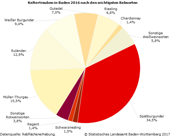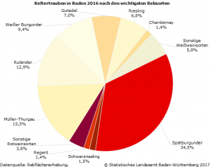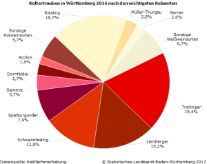 Die in Baden‑Württemberg mit Keltertrauben bestockte Rebfläche wurde mit 27 118 Hektar (ha) in 2016 gegenüber dem Vorjahr merklich reduziert. Ob das Minus von 111 ha das zufällige Ergebnis einer Momentaufnahme oder einer abwartenden Haltung der Winzer und Weingärtner auf die weitere Ausgestaltung der neuen Anbauregelungen geschuldet ist, wird die Zukunft zeigen. Wie das Statistische Landesamt auf der Grundlage von Auswertungen der gemeinschaftlichen Weinbaukartei weiter feststellt, liegt der Rotweinanteil derzeit bei rund 53 Prozent, der Flächenanteil weißer Rebsorten bei rund 47 Prozent. Damit ist seit dem Höhepunkt des Rotweinbooms 2007 (55,9 Prozent) der Flächenanteil roter Rebsorten stetig um insgesamt drei Prozentpunkte in zehn Jahren rückläufig. Zuvor, seit Beginn der 90er-Jahre, war tendenziell eine Verlagerung weg von weißen Rebsorten hin zu den Rotgewächsen zu beobachten. Insgesamt verzeichnet die Weinbaukartei für Baden‑Württemberg rund 180 Rebsorten, wobei in beiden Anbaugebieten mit jeweils rund 140 Sorten nicht das ganze Spektrum im Land vertreten ist.