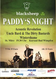 Blacksheep präsentiert Acoustic Revolution, Wintershome und Uncle Bard & The Dirty Bastards bei der 6. Paddy’s Night im Kursaal in Bad Wimpfen